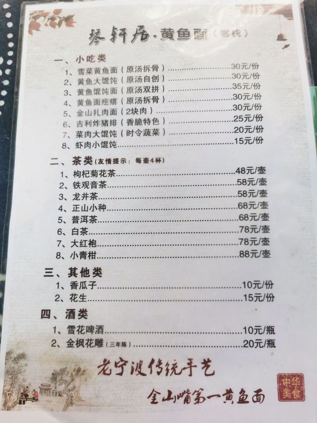黄鱼大馄饨,雪莱黄鱼面,吉利炸猪排,雪菜黄鱼面,招牌黄鱼面,黄鱼馄饨面(双拼),金山扎肉面,黄鱼疙疙瘩汤,黄鱼馄饨附带黄鱼原汤,鲜肉小馄饨,虾肉小馄饨,金山扎肉,炸猪排,小馄饨