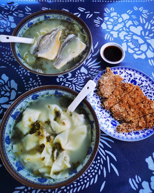 自由女神Min疫情稍有好转去上海周边逛逛,到现在才有空来评论,这家民宿连续住了两次。最喜欢临河的室外庭院,满园春色,古色古香,井井有条。择一张铺着扎染布料的桌子,沐浴在和煦的阳光下,吹着温暖的春风,听着悠扬的琴声,伴着潺潺的流水,沏一壶茶,吃一碗原汁原味的黄鱼面,还有什么比这更惬意的呢?网红店是名副其实的,老板娘和老板都特别的和蔼可亲,每天忙忙碌碌的拆黄鱼骨,熬制汤料,包馄饨,招呼客人。除了大家慕名而去的黄鱼面,我更推荐黄鱼馄饨和炸猪排。馄饨里面的鱼不是碾碎的,是一块块的,吃起来非常的鲜美。炸猪排是小时候的味道,实实在在很大。有时间还是建议住上一晚,享受人潮退去后夜晚的宁静和悠闲。离开的时候我打包了馄饨,老板还准备了汤,真是很细心!