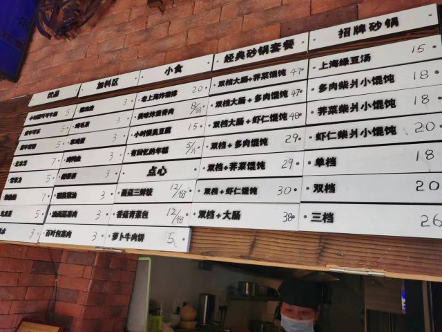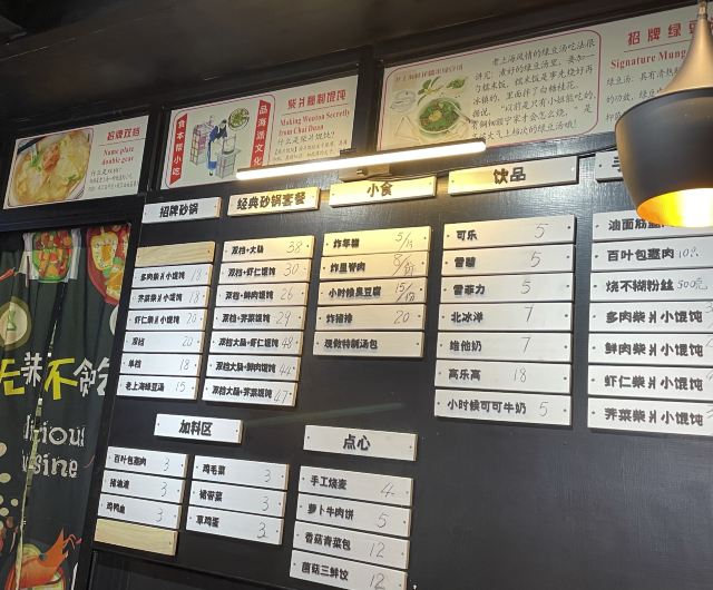 三鲜饺,老上海绿豆汤,双档,砂锅柴爿小馄饨,里脊肉,炸年糕,臭豆腐,炸猪排,可可牛奶,虾肉小馄饨,砂锅荠菜馄饨,小馄饨