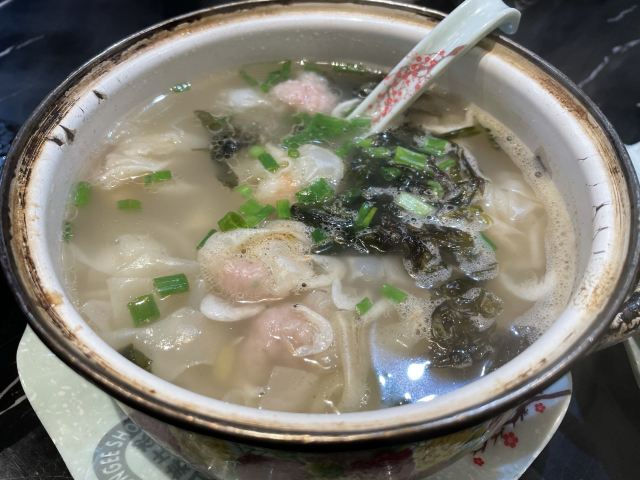 Mei wei Jia Old Shanghai Dual-stall Restaurant上海阿姨开的一家正宗老上海双档小吃店 除了他们家有名的双档汤以外 我还看中了砂锅小馄饨和特色绿豆汤 味道做的太好了 就是我小时候吃的那个味道 店里不是太大 座位也不算太多 估计工作日人肯定很多 双档汤+砂锅小馄饨 我们点了一个这个组合 原本以为应该是两碗 想不到却是把这两个结合在一起放在了同一个砂锅里 小馄饨的量不是很多 大概6个左右吧 粉丝还挺多的 里面还有两个油面筋和百叶包 里面塞满了肉肉 吃上去肉很鲜 食材也挺新鲜的 最爱喝的就是这里面的汤 应该是放了鲜辣粉的 这个鲜辣粉也是我小时候吃的那个味道 回忆满满 老上海绿豆汤 绿豆汤也是超级好喝 味道不是很甜 里面除了绿豆还放了桂花糯米和薄荷叶 吃上去口感非常的清凉 简直就是降暑神器