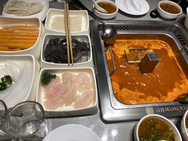 番茄火锅,招牌虾滑,炸豆衣卷,现炸酥肉,海底捞火锅,捞派毛肚,双椒滑牛肉,等位小食,脱骨鸭掌,捞派生鸭血