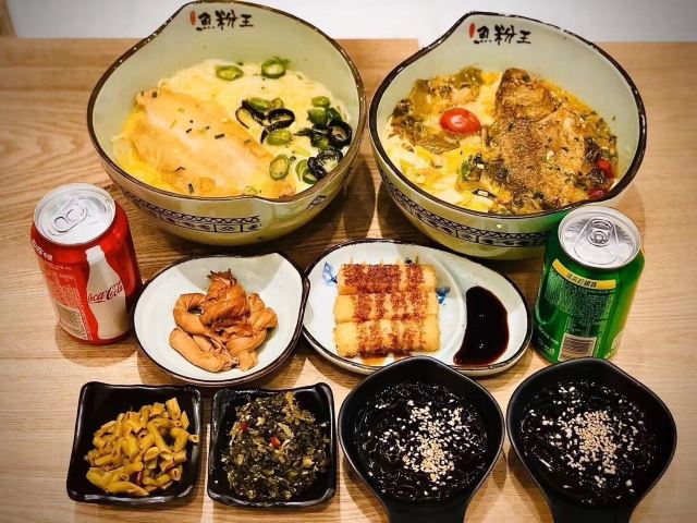 酸菜鲈鱼粉,红糖糍粑,米粉,秀水鱼头粉,金汤沙巴鱼,番茄巴沙鱼粉,自助冰粉,古法湘香鱼块,手打虾滑鱼滑粉
