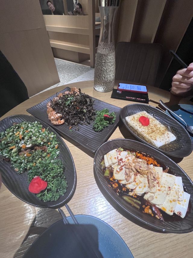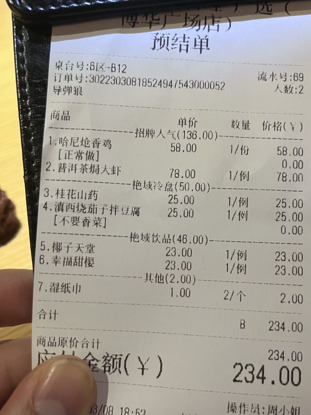 博华广场三层,整体挺空旷的+没啥人,就餐环境非常安静,这点很舒服! 不舒服的是,没啥人,但上菜还是挺慢的⋯ 【哈尼炝香鸡】说不上啥感觉,说好吃吧味道有点怪,说难吃吧感觉还挺上头 【普洱茶焗大虾】对于喜欢虾皮儿一起吃的人可能虾皮处理的太焦了,不过虾肉很有嚼劲儿,而且个头不小 【桂花山药】山药口感很丝滑,凉凉的很舒服 【滇西烧茄子】看菜单实在想象不到这道菜里居然有豆腐.口味还蛮有意思 服务: 服务人员不多,但响应还挺及时 环境: 理位置很棒,紧挨地铁,楼下就是博物馆+雕塑公园,吃完饭还可以散散步