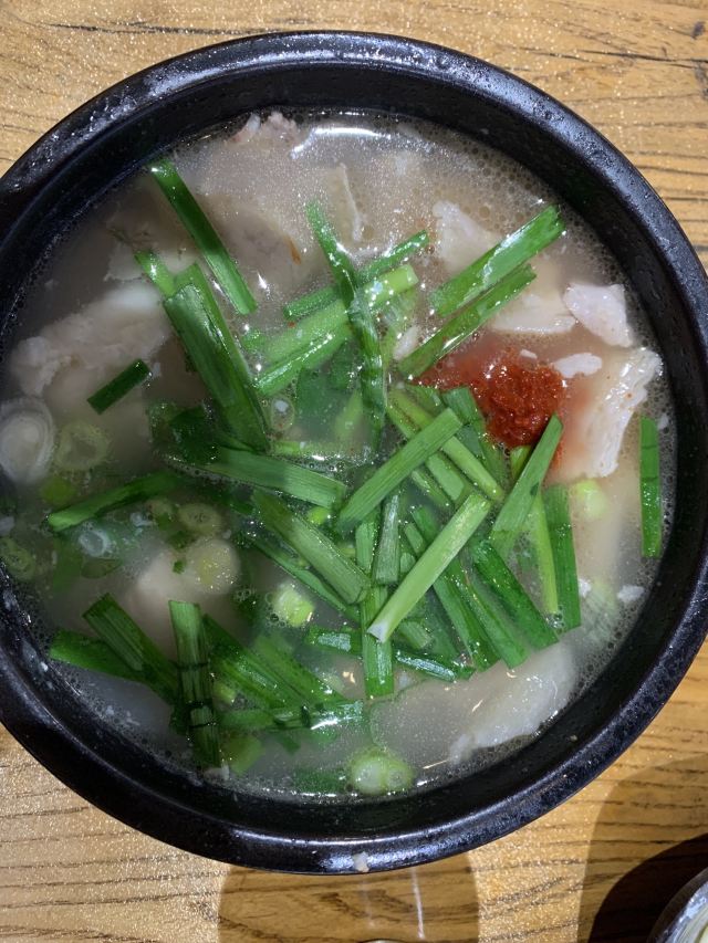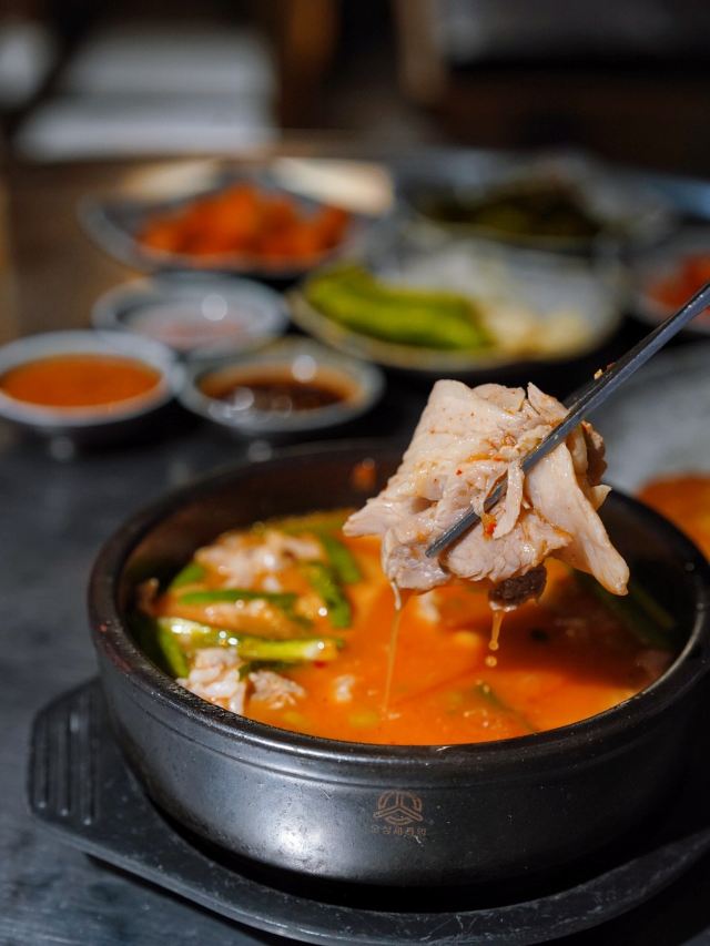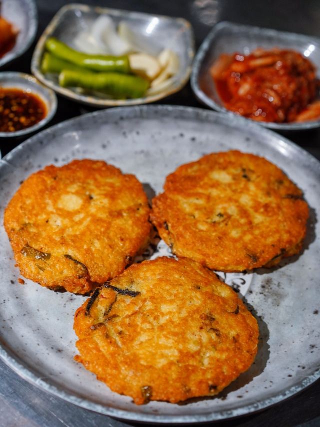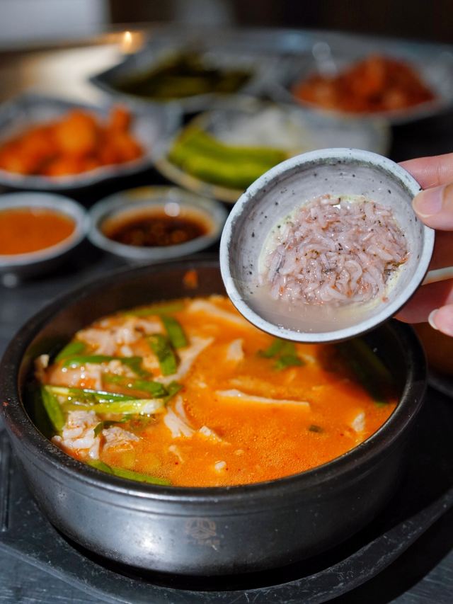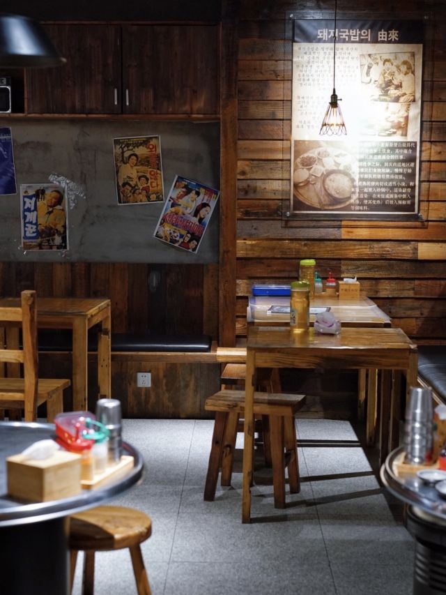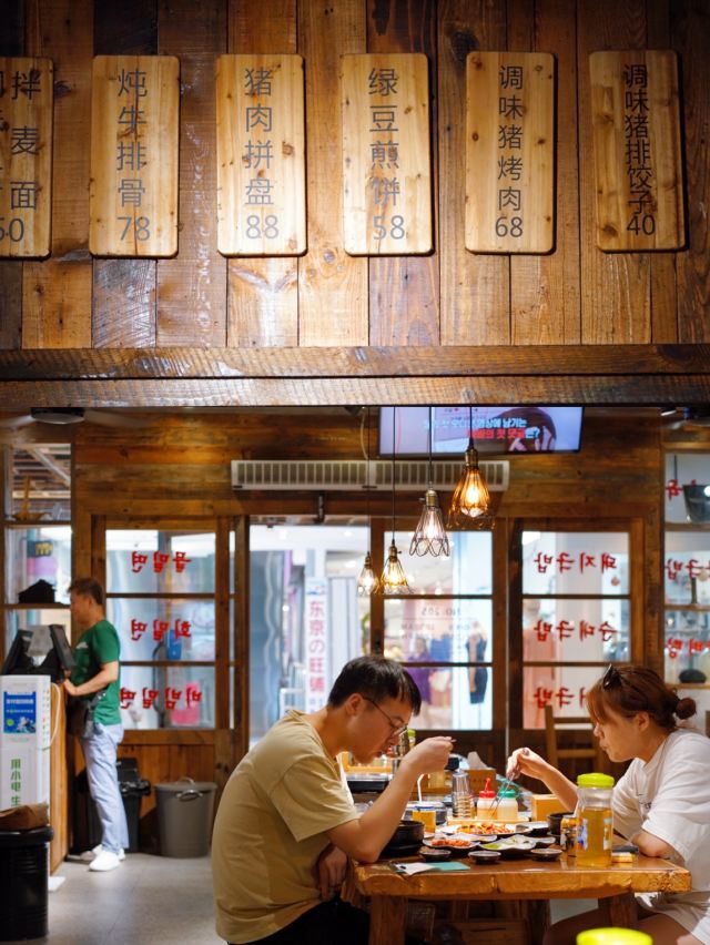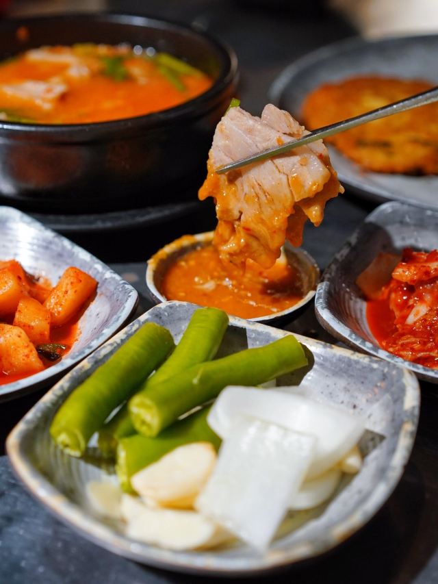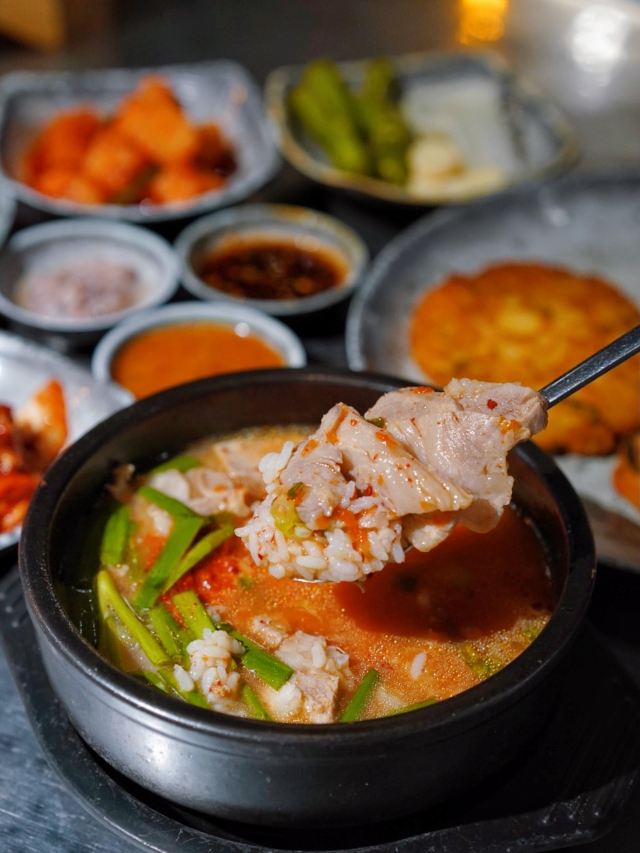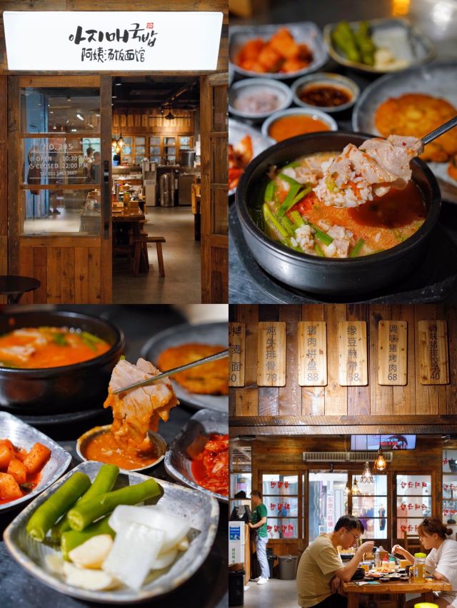 加油干饭呀韩国街宝藏小店🌟阿姨汤饭面馆🌟,光是店名就流露出一种亲切,温馨的韩剧同款小木屋,带你一秒穿越到釜山,超人气韩式土著料理无疑是聚餐圣地,高性价比更是赢得打工人厚爱❤️ 老板是地地道道的韩国人,匠心传承釜山特色乡土饮食,韩剧里的人气美食在这里统统都能get✔️ 人气TOP1的🥘猪肉汤饭🥘 吃过一次就秒变回头客,一锅泡饭搭配7 款小菜,汤底是由货真价实的猪骨熬制而成,咕噜咕噜冒泡,分分钟在线撩胃。 切成小块的猪肉片,吸饱汤底精华鲜嫩入味,佐以辣酱、韭菜等调味, 口感层层递进,鲜味也尽情释放 ⚠️店家还贴心预备了一小碟虾酱,供重口味患者自行添加哟 99%的人都没吃过的🥞绿豆煎饼🥞 吃过不少泡菜饼和海鲜饼,但绿豆饼还是活久见!没想到绿豆除了煮甜汤,还可以用来煎饼,瞬间解锁隐藏吃法👍 将绿豆面糊融合蕨菜、绿豆芽、红椒和青椒,煎至两面焦脆内心软糯,刚上桌时还有点烫口。 店员小姐姐会贴心地帮你剪切成小块,蘸上韩式泡菜酱,一口接一口停不下来的节奏~