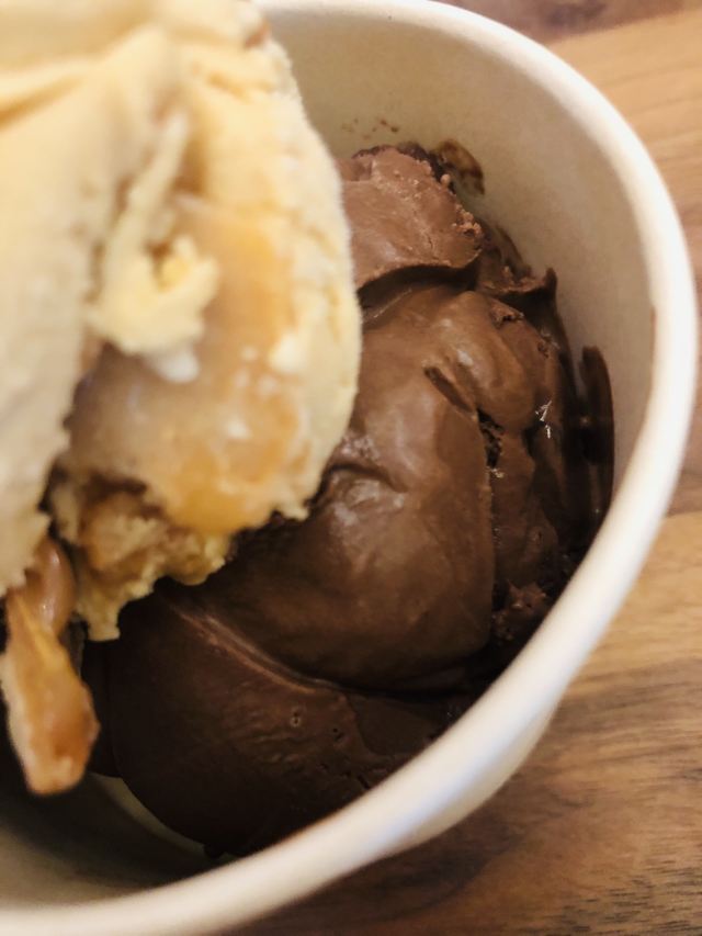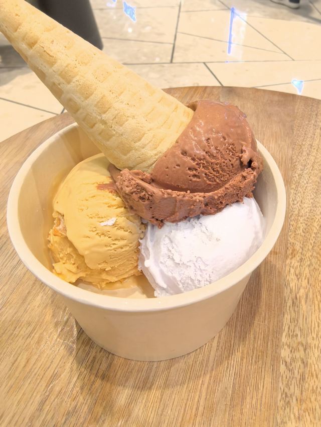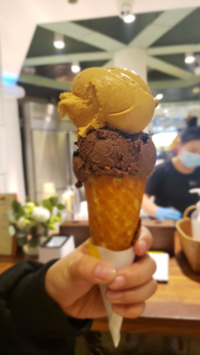 【口味】 不愧为[好吃de冰淇淋]排名前几名的商家,味道确实不错~ 买了一份小三球冰淇淋38元/份,三球口味选择了|焦糖海盐饼干^|冰蓝海盐牛乳^和|黑巧克力冰淇淋^,都挺好吃的~ 【环境】 在商场中庭开放式环境,座位不多,基本全满~ 【服务】 自助模式都需要食客找座位的方式~