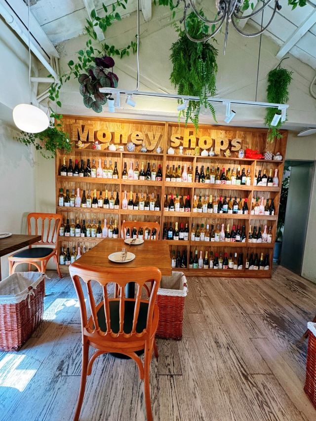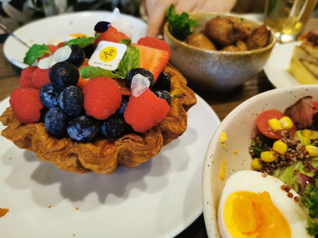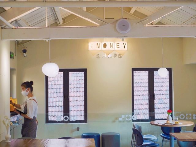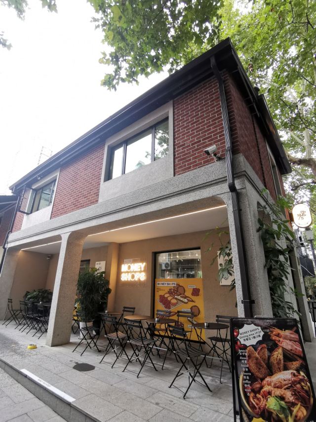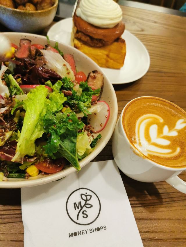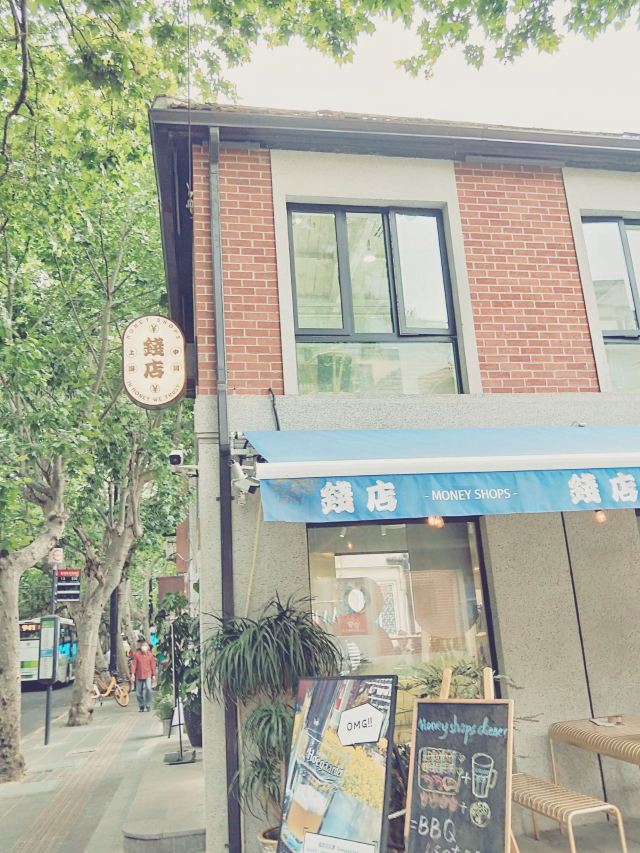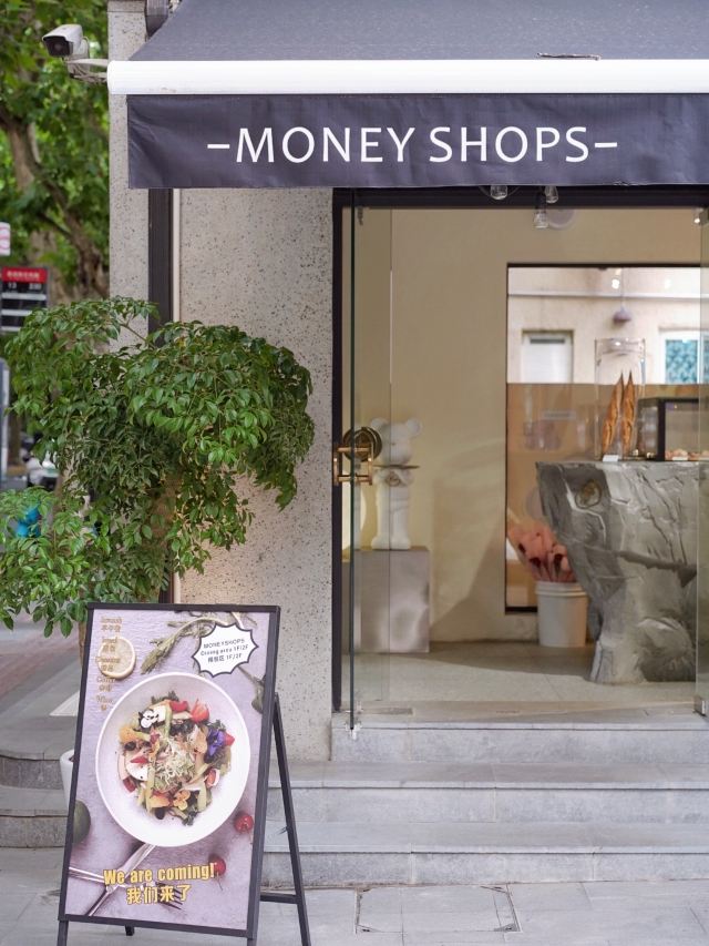 蓓家温暖每次路过愚园路上一栋百年独栋洋房,总会被漂亮的门面吸引,驻足拍照的人很多。这家叫Money Shops主打法式Bistro风格,全天候供应精致Brunch。遇到饭点大草坪旁都是等位的食客。 环境:店铺分为两层,一楼是面包甜品的售卖区,展柜里摆满了各式各样精美的蛋糕和甜点,周围是一片青翠的草坪和外摆座位,有很多外籍人士喜欢在绿荫下品味美食,轻松惬意。走上二楼的用餐区,复古绿为主色调的用餐空间宽敞而明亮开放式厨房和沿街落地窗带来舒适宜人的氛围可以俯瞰愚园路上的繁忙景象。 服务:门口等位时店员小哥哥很耐心的为食客取号并时刻关注店内翻台情况,母亲大人怕热怕晒所以想要室内的座位,等楼上有了空桌马上安排我们上去了。店员很忙碌,所以在视线范围内马上招呼,看到都会过来解决问题,态度也很好,整体服务不错。 【三文鱼牛油果沙拉】烟熏三文鱼量足美味搭配牛油果、藜麦色彩斑澜又健康。 【牛肝菌宽面】奶味非常浓郁,宽面质地软而不腻,口感非常好,里面牛肉很嫩菌菇提鲜。 【大虾塔帕斯】鲜虾的鲜嫩多汁,搭配上蜂蜜芥末酱的独特香辣味,还有干岛酱的浓郁口感,下面还有酥脆的面包干简直是人间美味啊。 【和牛汉堡】大汉堡里面用料丰富,培根、鸡蛋、牛肉饼番茄和芝士,我们请店员切分后品尝,有层次感和牛鲜嫩多汁饱腹感强。 【开心果肉桂卷】表层铺满了细腻的开心果碎,带着浓郁的坚果香。奶油不会过于甜腻,肉桂味浓郁,我觉得好吃。 【莓果布丁】几乎每桌必点且出圈的法式大蛋挞铺满各种新鲜莓果、有草莓、蓝莓、树莓、第一口必须给手机吃,上面的莓果挺酸的但和莓果酱和蛋液一起吃还是不错的。 来这里我喜欢优雅舒适的用餐氛围,随处可见三五好友一起轻松惬意的聊天并享受美食。睡到自然醒,吃一顿颜值在线的早午餐,这份慵懒感是Brunch 给的。