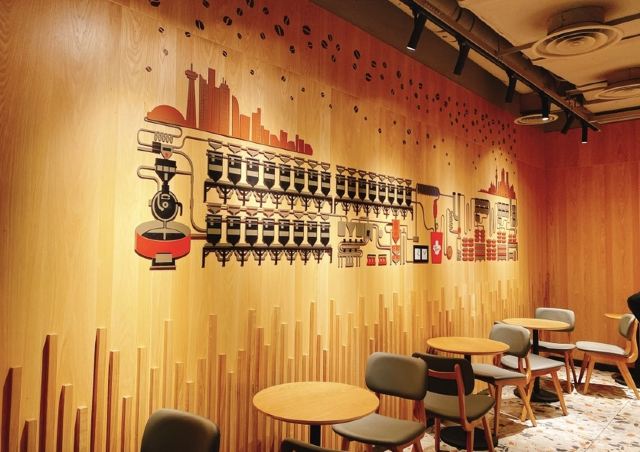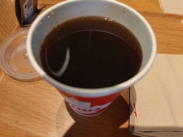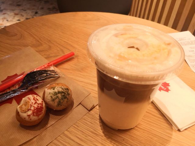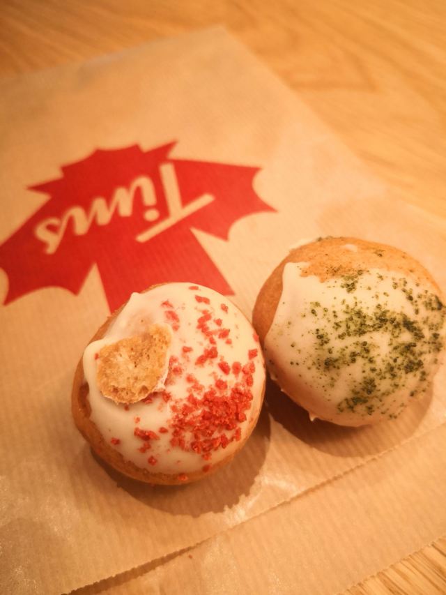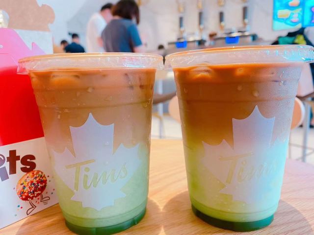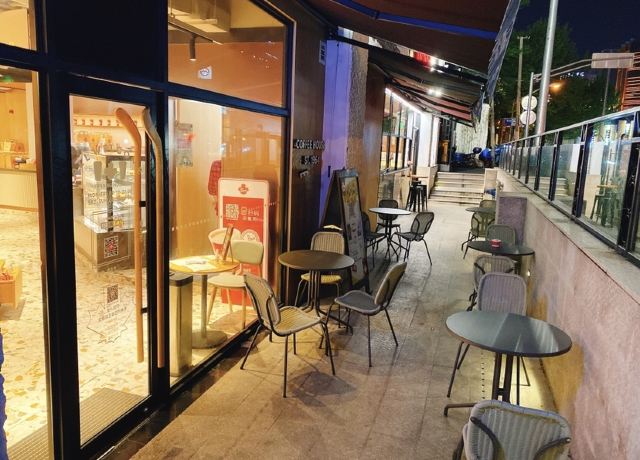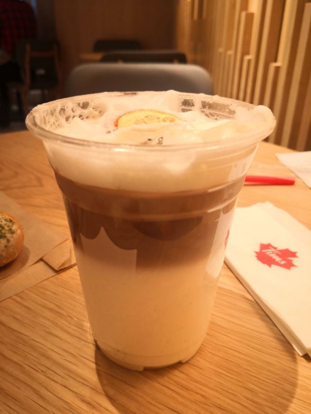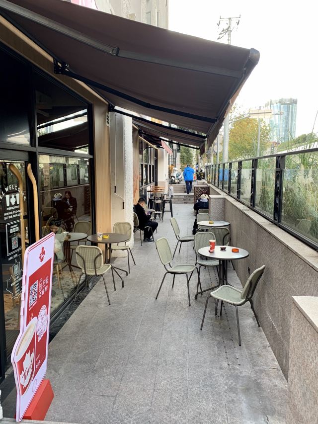 ma****ly对于TIMS,如今的态度就是找一家不曾光顾过的分店,点一杯当季的新品。 这家位于南昌路上的TIMS,偏于大厦一楼的右侧,不知道是不是因为区域划分的原因,狭长的店铺在客座区域上显得有些局促。 疫情还未完全结束,店员提倡客人带走咖啡或饮料,但憋了太久的人们更愿意坐下来细细品尝。 这次点了当即的新品咖啡,橙花白巧风味玛奇朵,搭配了两款新口味的天趣球。 橙花白巧,咖啡加牛奶,浇上了白巧克力酱和枫糖。喝掉微甜的泡沫和表层之后,回归了酸苦的咖啡本味,这个时候,甜甜的天趣球可以出场了。 两款新品天趣球,分别是红丝绒蛋糕和抹茶的,其实它们是实心的,只是在表层顶部抹了一层红丝绒和抹茶,倒让天趣球的味道不那么甜腻了。 餐厅外有一处不大的室外餐桌,暖阳下成了大家争抢香饽饽。
