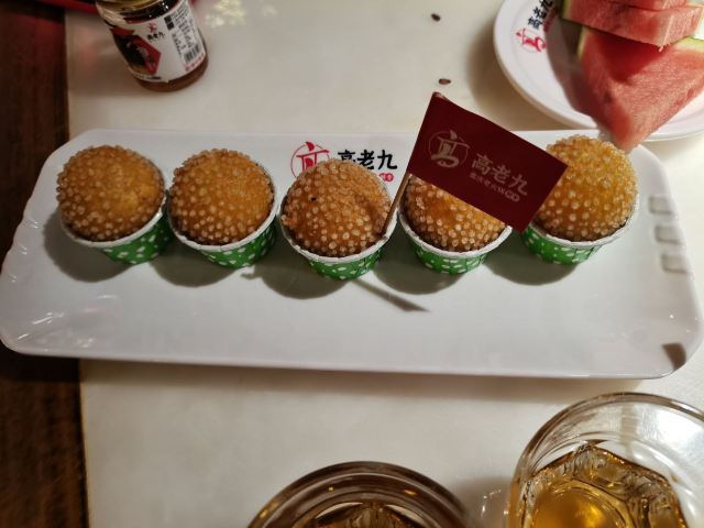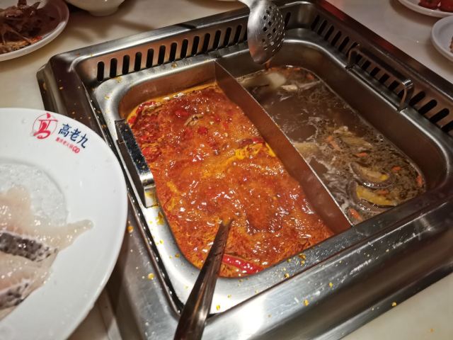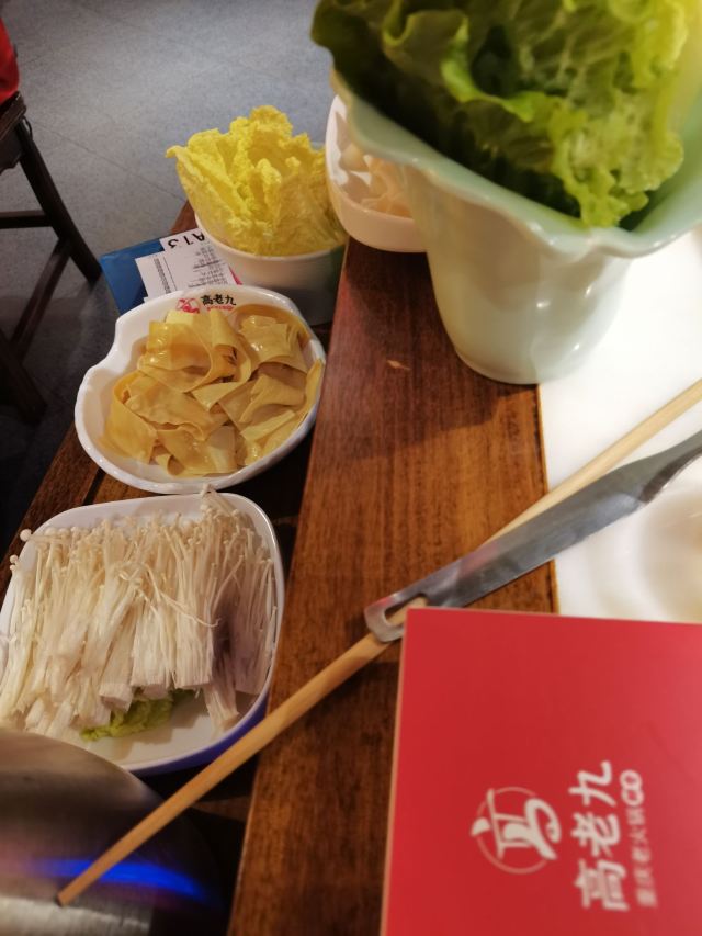 冬天到了,经常吃火锅,高老九是很喜欢的一家连锁店。这次过来点了鸳鸯锅底,羊肉,牛肉,毛肚和鸭血是必点的,锅底的四个牛蛙吃的不过瘾,后面还加了三只。其他食材也都很好,高老九的品质一直是有保证的。领班看到我们带着个小朋友,还送了一份椰汁馅儿的点心,名字忘记了,也很好吃。吃过几次高老九,没有一次不满意的