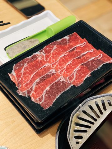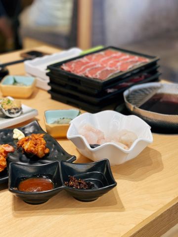 🚗一心牛位于新世界百货的4楼,交通还是比较方便的,地铁人广站7号口出来就是新世界。 🌸店里分为烤肉区和寿喜锅区,两个区域分开运营模式只能择一。我们去的时候,吃烤肉需要排队,只能选择寿喜锅。寿喜锅分为好几档,我们选了第二档169的,会员价是160。 🍡169那一档只有美国牛肩肉和澳洲牛肩肉可以吃吃,然后就是虾滑,生蚝和明虾。选了169的,120档的也可以点,但是没啥值得吃的。丸子,鱼片,蔬菜等火锅菜是自助,每档都可以享用。另外还有限量刺身,每人各三片北极贝,三文鱼和鲷鱼。 🥘牛肉还可以,虽然菜单上推荐的是澳洲牛肩肉,但我更爱美国的,感觉肉质更细腻,当然也可能是弄反了,他们家盘子上都不标注肉的品种。生蚝一般,明虾和虾滑还不错。 个人建议可以点220那一档,牡蛎肉还是很好吃的。
