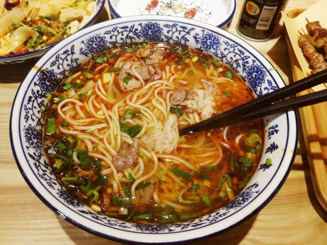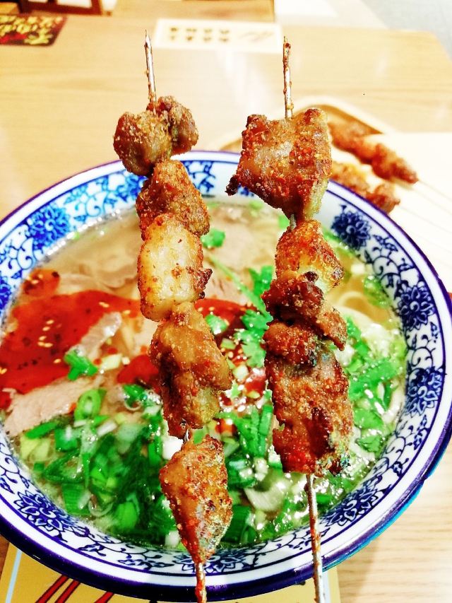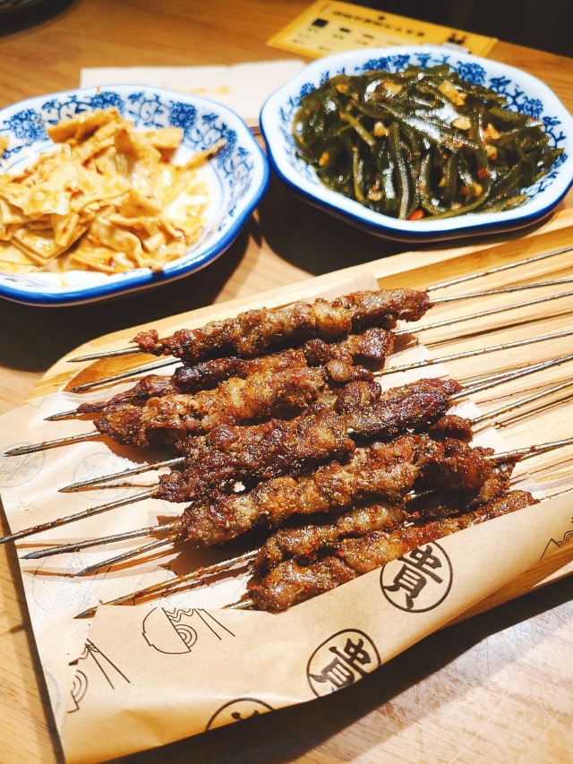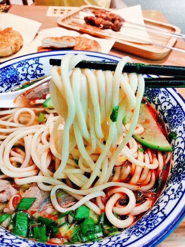 牛骨清汤兰州牛肉面,钢钎羊肉串,兰州牛肉面,凉拌木耳,钢钎羊肉半把,二细,茶叶蛋,酸辣烤羊肚(5串),加面,限量招牌牛骨清汤牛肉面