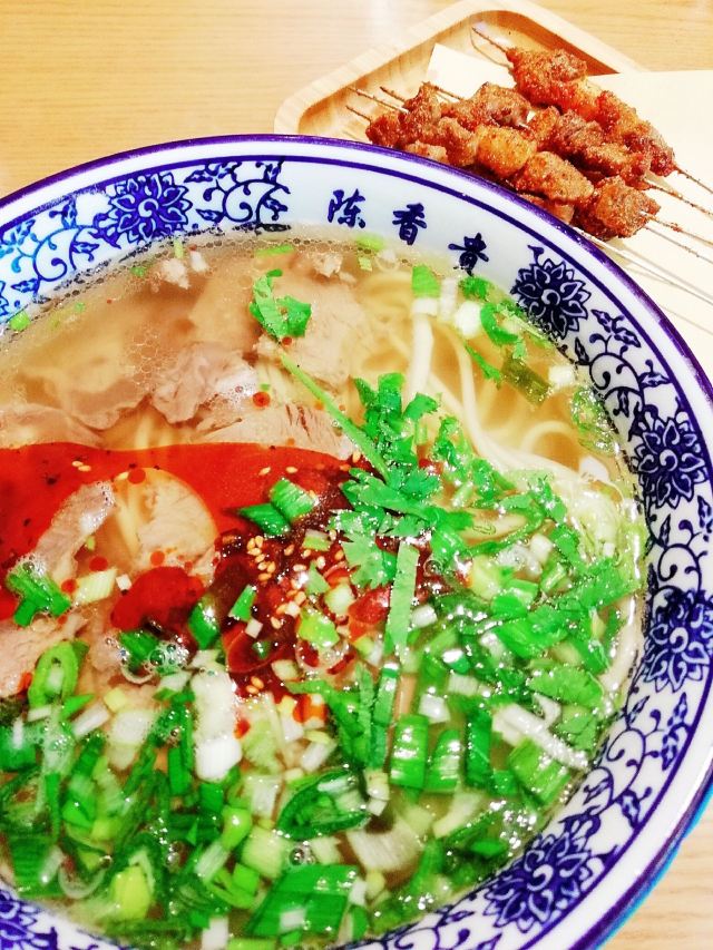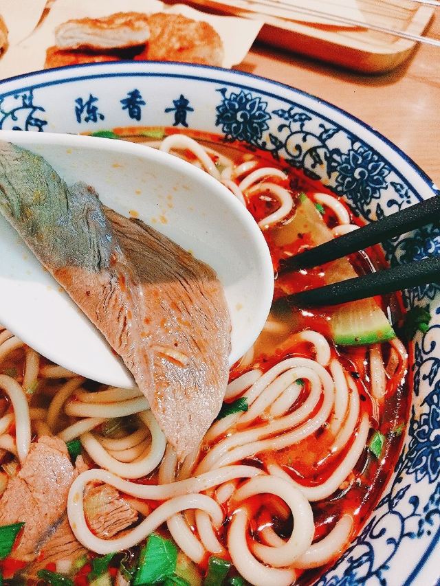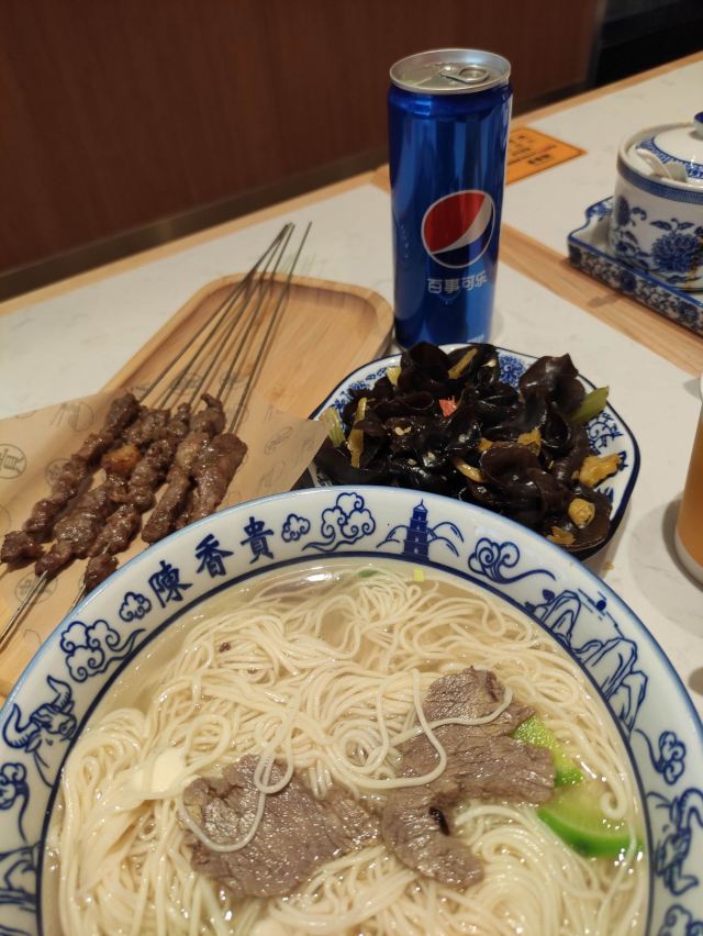 amydog2021-6-11 🍜吃过了魔都陈香贵,真的是要泪奔梦回兰州 跟兰州本地拉面大概是要相差10086碗牛肉汤头了😔 召唤射手小分队,终于能凑到人能去吃大碗兰拉咯😄因为之前在马路上隔着玻璃有看到过别人一家三口点了个大碗好嗨皮,艾小米心心念念了好久 【口味】 |牛大碗^4人份,碗是真的大,不,这不是碗,是面盆😅端上第一眼除了觉得碗大,还有就是觉得牛肉浇头也太少了吧,星星点点的塞牙缝么🤢剪面的过程很快乐(那位专业剪面小能手毕竟之前已经吃过好几次陈香贵大碗了😊).吸面第一口,就觉得很失败,可能就是传说中的没有对比就没有伤害吧,身边还有另一位射手女和这位剪面小能手都说陈香贵很好吃,嗯,不怪你们,毕竟你们是没见过世面没到达过兰州的射手😁兰州当地随随便便的一碗兰拉就果断秒杀魔都陈香贵,一碗牛肉汤头估计从兰州到上海打翻到了只剩1/5了吧,汤真的很淡几乎吃不出牛肉味🙃又没有汤头加持,牛肉又少得塞牙缝……这🤢 |钢钎羊肉串^烤得很老,肯定是不满意的 然后小伙伴在面里吃到了辣椒酱的塑料袋剪角,两次,果断要求退单 【服务】服务还算是让人满意的,危机公关临场能力很强,一直在抱歉,飞速退款,这个很厉害 【环境】店不大,有提供免费红枣水,很淡(是红枣水不是红枣茶)😄很干净明亮是真,午餐时段店外需要排队也是真