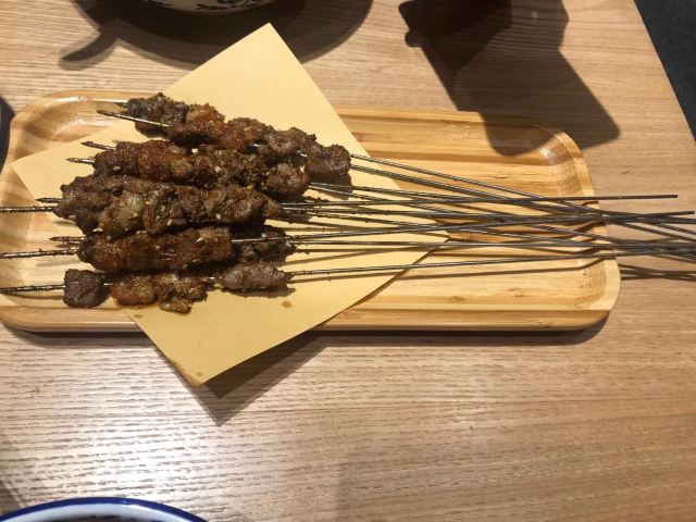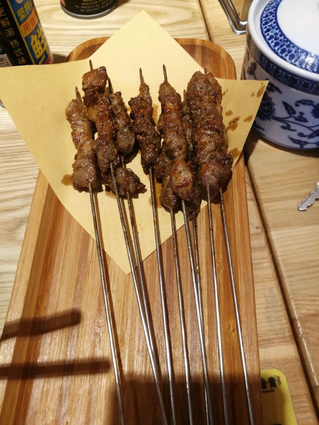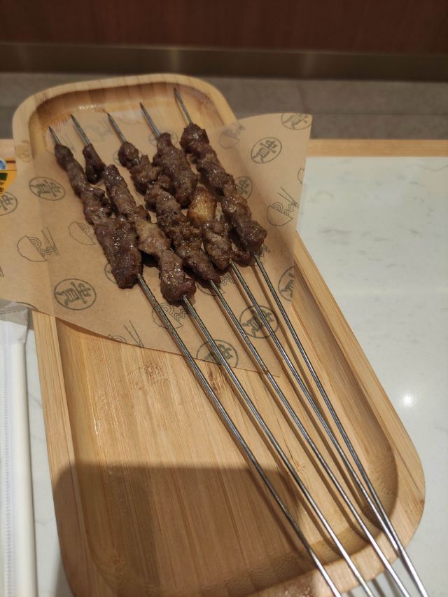 套餐包括一碗牛肉面、凉拌木耳、五支羊肉串和一瓶百事可乐。羊肉串最推荐,很嫩,瘦肉比例高,趁热吃更香。牛肉面选了毛细,我喜欢放一会吃,这样面可以吸入更多的汤味儿,这家的面条不糊,汤鲜,牛肉片也不少。凉拌木耳有点辣,但似乎还带了些甜味,脆脆的。很喜欢店里免费提供的大枣茶,解腻又暖胃。