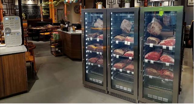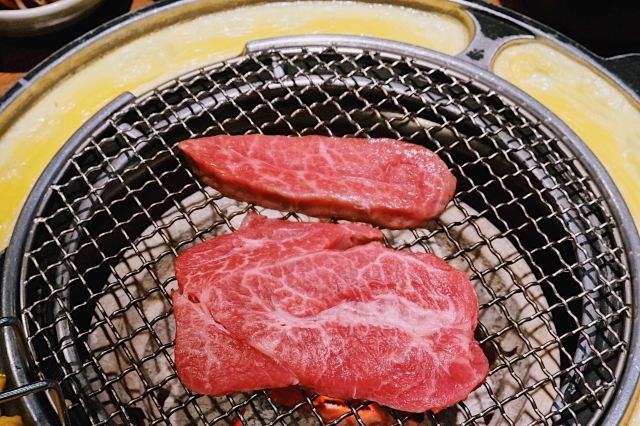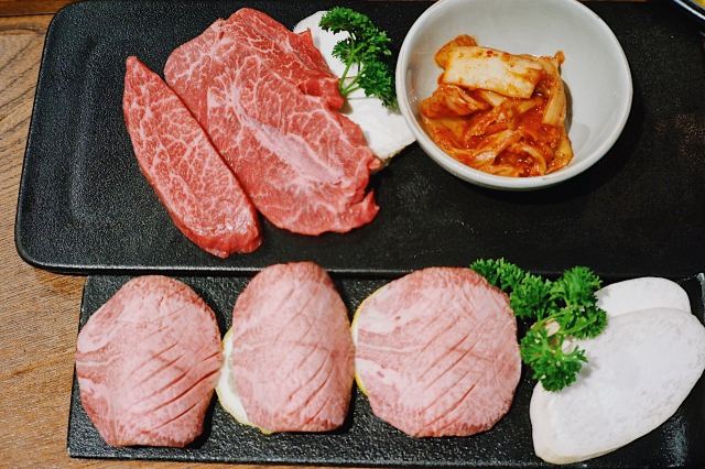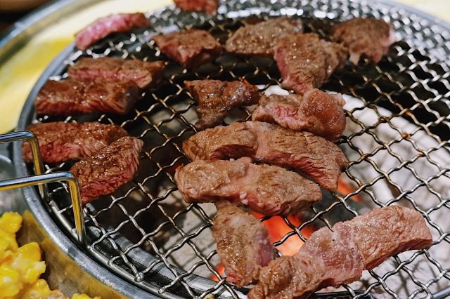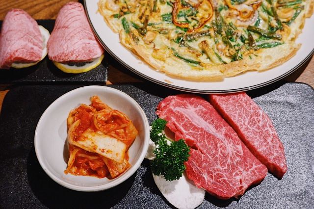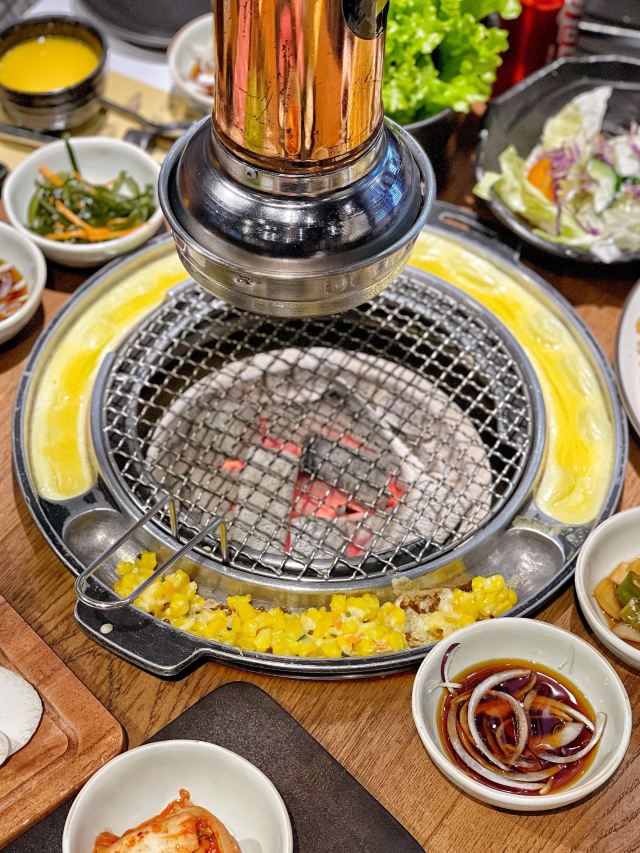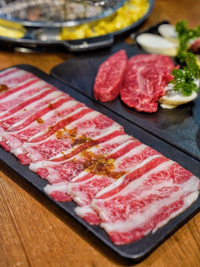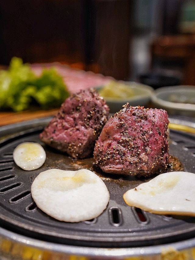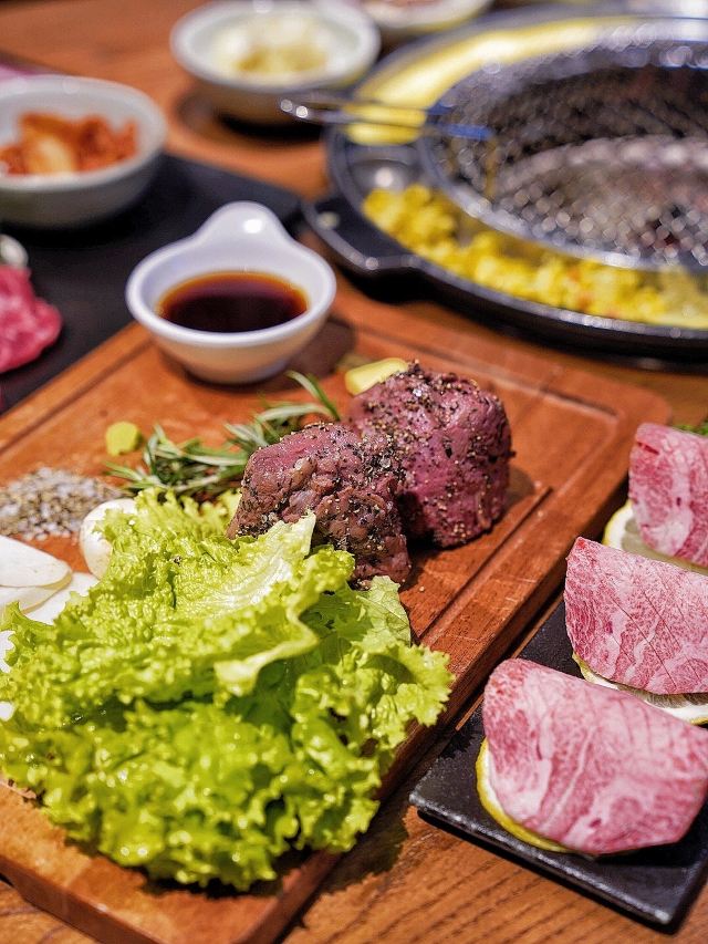 吃饭就别叫我了韩国街的金冠餐厅👑善煜熟成和牛烤肉👑,厚切还原肉本味,熟成健康好口感。一进店迎面就是干式熟成柜,通常将牛肉按部位切分后放置恒温0°C冷藏。熟成时间越长的牛排价格越昂贵,而且比湿式熟成肉质更细嫩柔软。 店内招牌擅长用数字说话💁🏻♀️5厘米菲力、4厘米牡蛎肉、3厘米西冷,每一块都厚度惊人‼️一上桌就让你发出尖叫声‼️旁边还配有一把小金尺,不信的话可以亲自给肉肉量身高哟📏 店员先用黄油在烤盘上抹一圈,随后将5厘米菲力整块煎烤,最后切成均匀薄片方便食用。横截面呈现出玫瑰粉的诱人色泽,鲜嫩多汁完全不输西餐厅出品。 善煜特上厚切和牛牛舌根,肉质厚实紧致又不失柔嫩,每一口都富有嚼劲回味无穷。最重要的是,一边烤肉一边还能吃玉米粒和鸡蛋糕,让你的嘴巴一刻不歇,真是一举两得呢✌️