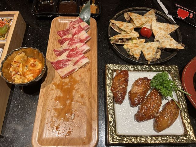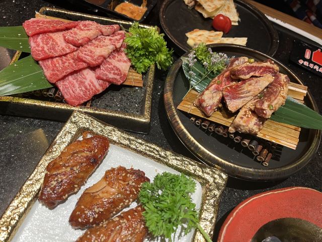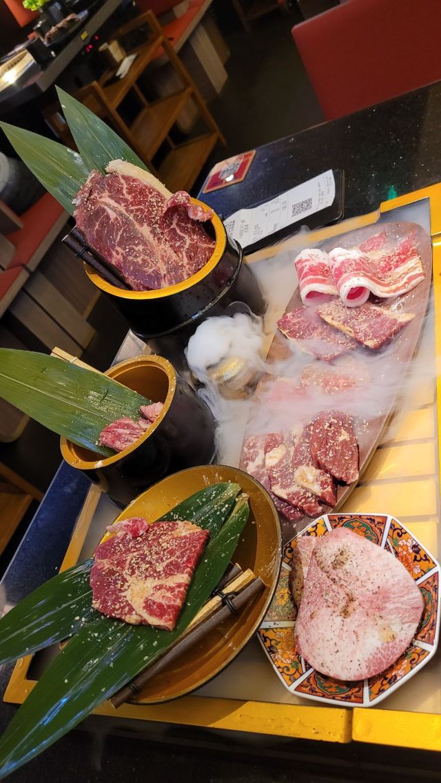 精选牛五花,特上雪花牛小排,土豆泥,烤年糕,薄切牛舌,昙石和牛外脊,牛肉饭,芝士焗地瓜,松板猪,牛上脑