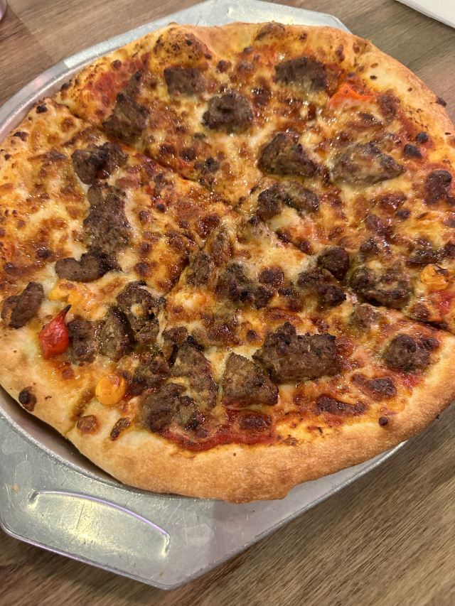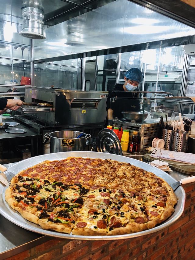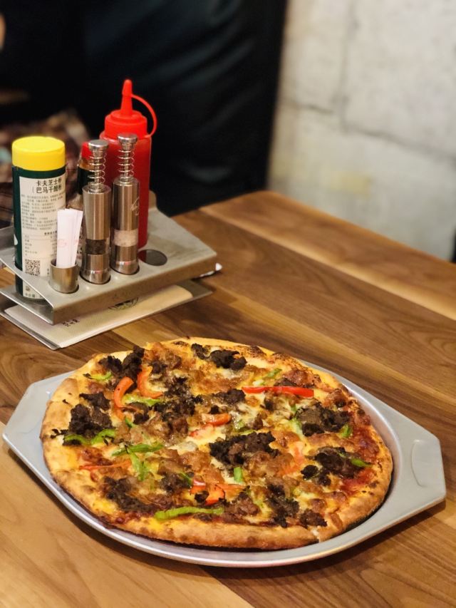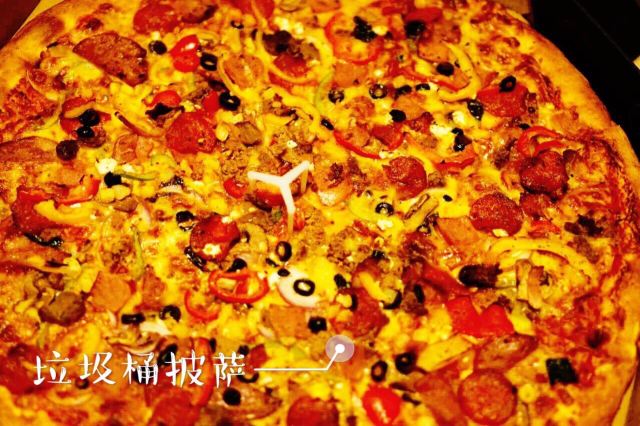 📍TX淮海4层 【环境】美式街头风格,店内比较暗。 他们家有个32寸的怪兽级超大披萨,2个人才扛得动。 【垃圾桶披萨】185元/份,19寸。料超丰富,三个人吃都没吃完,超级大。 点他们家的饮料,喝完还能把涂鸦杯子带走(店员会给你全新的)。