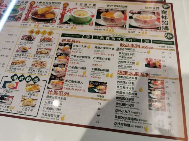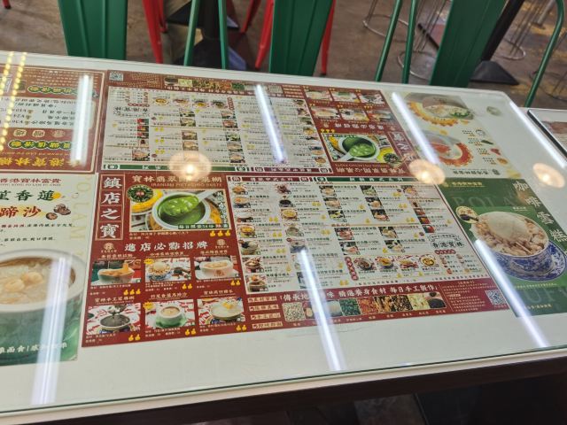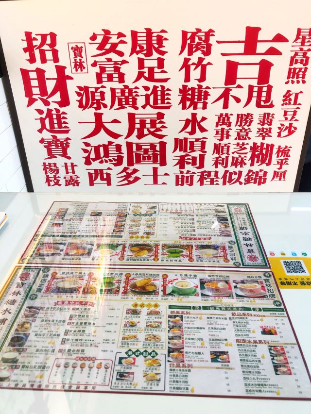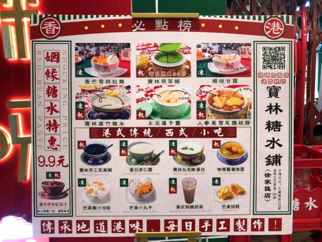 杨枝甘露,香芒雪糕拉麵,咖喱萝卜鱼蛋,寶林翡翠糊,莲子百合红豆沙,红豆莲子汤,傳統糖不甩,寶林手工芝麻糊,芒果小丸子,鱼肉烧卖