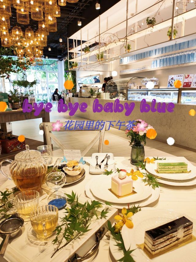 🌸🌸🌸一家森系花园风的网红甜品店,拍照环境相当美,不远千里迢迢到此打卡探店,下午茶的精致享受。 🥰【店名】bye bye baby blue(旗舰店) 🏠【地址】吴中路1155号 🚇【交通】地铁9号线合川路站步行15分钟 [薄荷]环境:森林系,花园式的环境,有桌椅,有沙发,各种饮品和蛋糕甜点选择,拍照美美哒。 [服务铃]服务:店员招呼热情友好,进店就给顾客测温登记,防疫措施严谨,茶水主动添加。 💗💗💗【下午茶套餐】 |蜜瓜水果茶^摆盘精致,有一个沙漏⏳等倒完差不多就可以喝茶啦,这款茶味道很香,很好喝。 |巧克力歌剧院^蛋糕口感属于偏干型的,不过看了介绍,觉得可以细品一下丰富的内涵。 |抹茶歌剧院^这款是抹茶口味的,不过个人喜欢巧克力口味的。 |法式泡芙^泡芙一款是抹茶味,一款是原味的,味道不错,搭配的巧克力也好吃。 🌸另外还有半价折扣款享受,只是居然忘了叫什么名字了,味道很好,里面凉凉的,不甜腻。 🌈💨某平台购买的优惠套餐实在是太太太划算了,DP上也有各种优惠,还是很给力呦!