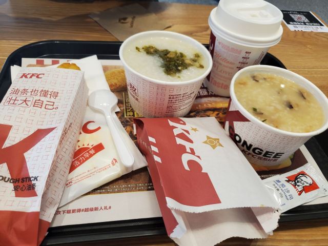 醇香土豆泥,香菇滑鸡粥,牛奶,黄金鸡块,抹茶冰淇淋花筒,香辣鸡翅,油条,鸡米花,摩卡,皮蛋瘦肉粥