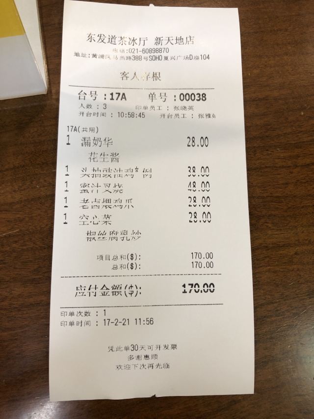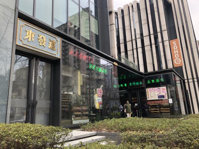 秋趣东发道茶冰厅(新天地店) 地址:马当路388号复兴SOHO沿街商铺D栋 交通:地铁13号线新天地站4号口步行不到100米 对于上海人来说,除了本帮菜,比较能接受的就是粤菜了,这些年港式餐厅在沪上也纷纷兴起,蛮受欢迎的。 东发道茶冰厅是经营较好的茶餐厅,且越来越红火,这家连锁店的创始人来自香港,他家除了口味正宗,餐厅环境设计融入了浓浓的香港文化,一些物件的摆放,充满了港式情怀,对于眼下不适合出境的大环境下,到这里用餐仿佛假装到了香港。 我门中午11点到的,已经要等座,餐厅以二至四人座为主,生意太好,餐桌位置紧凑,显得有点拥挤。 四个人点了连点心十道,果然口味很棒,豉油鸡嫩而入味,滑蛋炒虾仁虾仁不少,黑椒汁猪扒煎蛋饭很香,北海道牛乳冰很有特色,小朋友喜欢。招牌奶茶也挺好,总之,可以看出他家食材选料精,烹饪独家风味,难怪生意这么好!