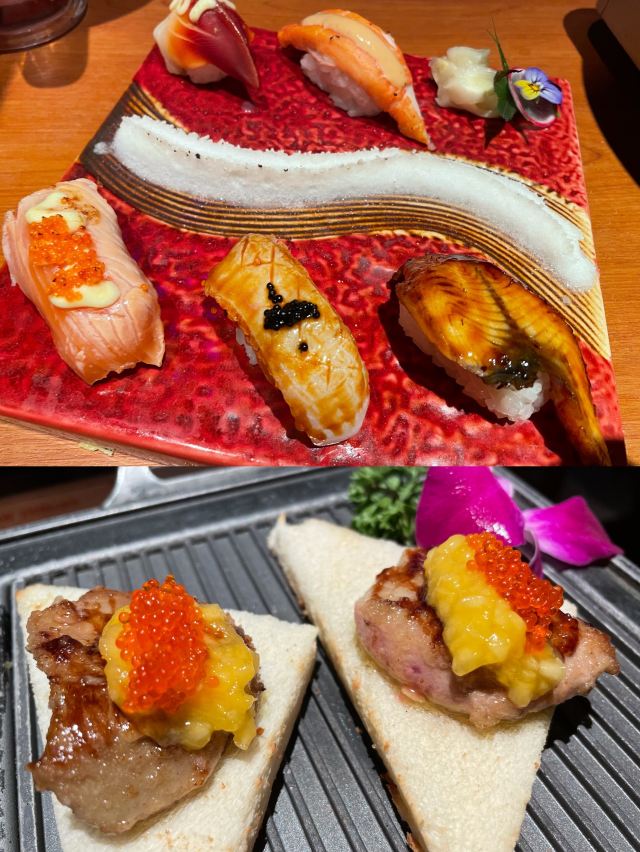 富士山寿喜烧,京都手作芝士豆腐,融化肥肝,铺天盖地和牛炙烧,芝士焗蟹宝,刺身拼盘,明太子烤土豆,厚切牛舌,赤焰寿司拼盘,芝士豆腐