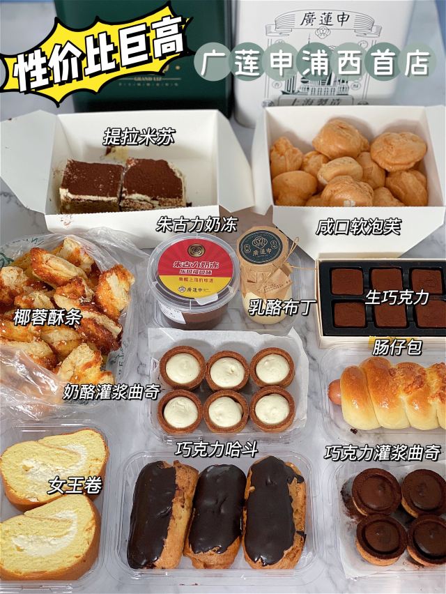 Sasa0828廣蓮申|浦西首店|性价比巨高的神仙甜品店 最近超火🔥的网红甜品店终于来浦西啦‼️‼️‼️ 身为浦西的宝宝瞬间感动的泪流满面 终于不用再大老远的跑去浦东解馋啦👻 店里糕点种类非常的多 估计有不下几十种 一次根本就买不完 价格亲民 用料好 趁着现在人还不是太多 赶紧跑去多买一些囤家里慢慢吃 顺便在这里给大家做个简单的小测评吧!!! ✅店名→ 廣蓮申 🔆坐标→ 共和新路4928号(地铁1号线共康路站) 1️⃣咸口软泡芙 店内的招牌 一定要买 真的真的很好吃 奶油口感轻盈 吃上去一点儿也不腻 算下来平均1元/个 这性价比真是没话说了 2️⃣灌浆曲奇 有两个口味(巧克力/奶酪) 造型很小巧 一口一个刚刚好 外壳酥脆 巧克力不是很甜的那种 略微带点苦味 奶酪是这次新出的口味 同样口感不甜腻 3️⃣女王卷 这个不同于一般的瑞士卷 用勺子挖着吃的时候会有沙的感觉 就像是气泡被刮破一般 口感特别的蓬松绵软 入口即化 4️⃣巧克力哈斗 💰15/3个 这个也是爆炸好吃 巧克力控一定要点 外皮松软 里面满满的都是巧克力馅儿 层次感非常丰富 一口下去真是太治愈了 5️⃣椰蓉酥条 用的是椰蓉而非椰丝 香脆可口 用料真的很良心 6️⃣朱古力奶冻 怀旧的包装 童年记忆瞬间扑面而来 口感顺滑香甜 巧克力味超浓郁 是小时候的那个味道