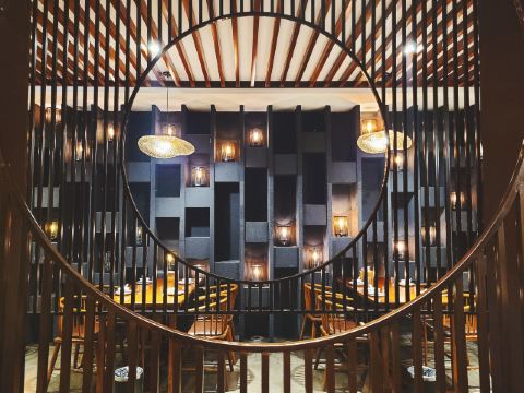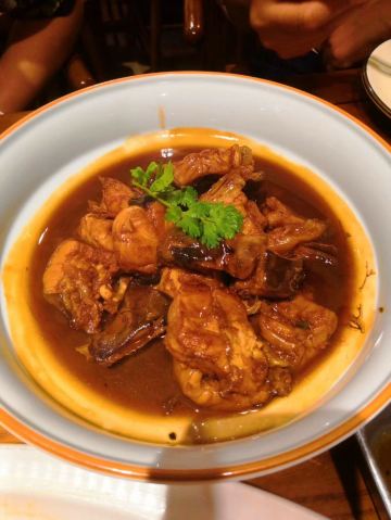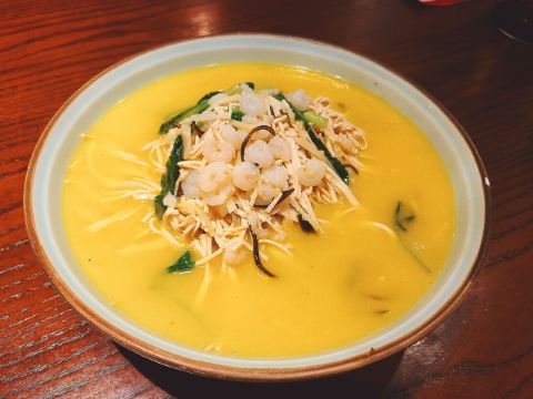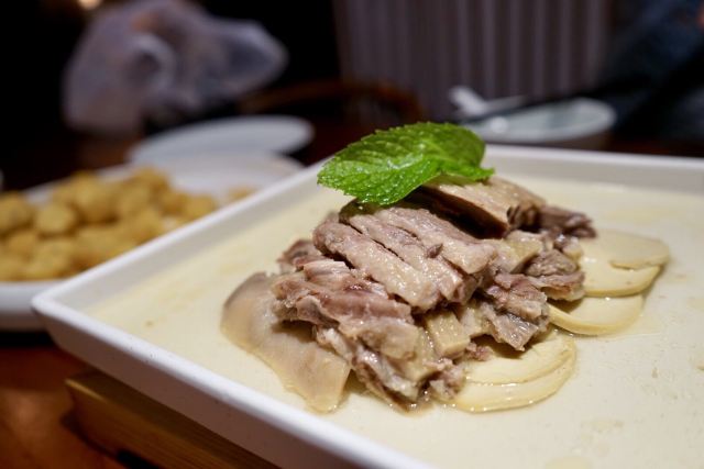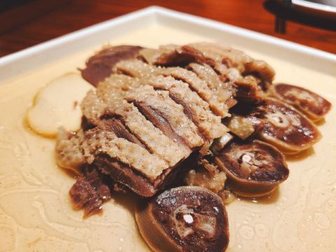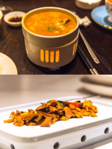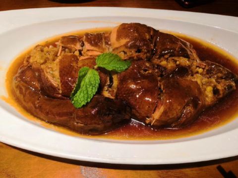 餐厅位于扬州大学瘦西湖校区里,是非物质文化遗产淮扬菜传承基地,同时也是虹桥修禊文化申遗基地。室内外的设计都很高雅,外部以石为元素、内部以木为元素,富有现代感。店内的八宝葫芦鸭是淮扬菜里知名的功夫菜,整鸭外皮完整没有破损,上色均匀,在灯下泛着油润的光泽,令人食欲大增。