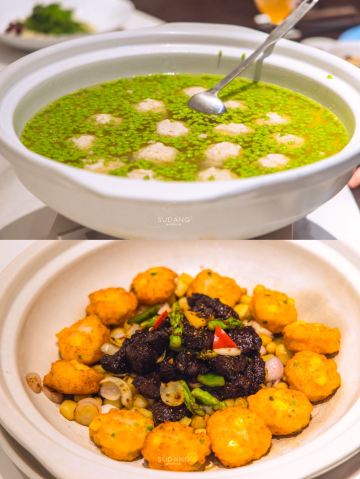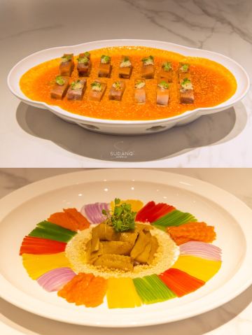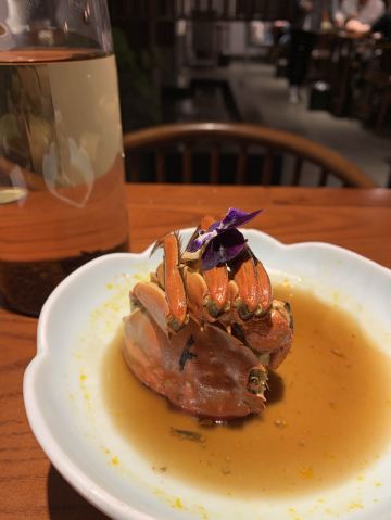 苏丹卿宋时,欧阳修常携宾客于平山堂饮宴。文章太守,挥毫万字,一饮千钟,淮扬菜典雅俏丽的人文风格由此而起,经年不衰。 平山宴以此为灵感,取名平山宴,着实吸引了我。 作为淮扬菜非遗传承基地,平山宴创新不辍,四季宴更是充满了文人味道。 惟有绿荷红菡萏,卷舒开合任天真。真是幸得此生多遇扬州,才没错过平山宴的这一顿夏宴。 时至六月,不时不食的扬州人又将给淮扬菜带来怎样的创新呢? 一盘精致的冰镇莲藕、莲子、莲蓬拉开了此次夏宴的篇章。恰逢梅雨季节的扬州,白天稍些湿热,但傍晚后的瘦西湖晚风轻轻拂来,眼前的这道前菜堪称“冰镇荷香”,令人赏心悦目的同时还感到阵阵舒爽。 前菜十分丰富,像洋花萝卜海蜇头、双黄灯影鱼片、红油蒜泥猪头肉、风生水起三文鱼捞冰脆鸡、橄榄茭白辣木苗等光从摆盘、造型上来看,就像是一幅幅精致的画。 前菜如此精致,不敢想象主菜将会如何拿捏我的视觉与味觉。 淮扬三套鸭、三虾嘶马拉豆腐、醋溜东海大黄鱼、红油蒜泥猪头肉、蜂窝鱼子酱西施乳、大红袍脆皮肥肠、虾籽清炖狮子头等,每一道菜都令人忍不住大快朵颐。 还有被花椒粒包围的六月黄(螃蟹),这道菜有点川味的感觉,大红袍脆皮肥肠亦是如此。此菜一入桌,很快就被朋友们吃光了。我除了馋三虾嘶马拉豆腐,对蜂窝鱼子酱西施乳也是颇为喜欢的。 此时,饮一杯酒,再吟一首诗,眼前佳肴如此风流,我仿佛融入了欧阳修的宴席中。