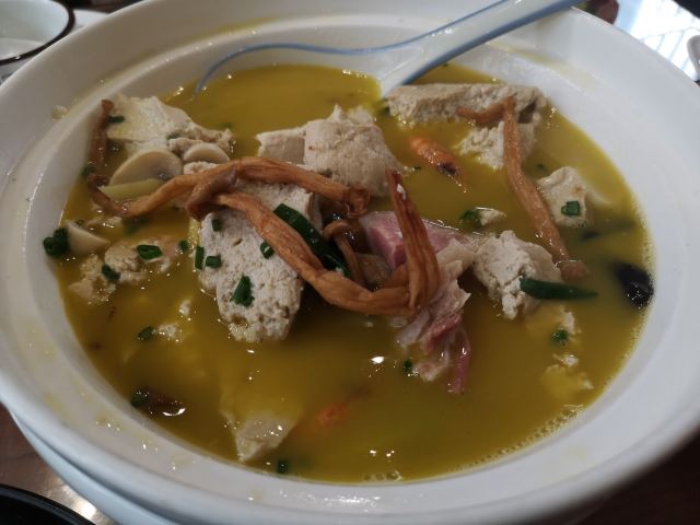 小笨熊2018这家店据说是凤凰镇第一家开的农家菜馆,因为有个外地女婿,所以菜单除了当地特色菜还加了一些外地菜。 【环境】 店就是农家宅院改建的,环境还行,因为口碑不错,人气旺,当地人来吃得也不少。这里午饭十点半就开始了,大厅的要早点来。包间要提前预订哦。不过来迟也可以到外面粉黛园转转拍拍照,有秋千啥的,等一会,翻台也快。 【口味】 |手工大混沌半分^这个馄饨很好吃,有虾肉吧,三鲜的。小朋友吃了好几个。 |鸡汤凤凰豆腐煲^汤很鲜美,有河虾,豆腐是老豆腐,有豆香。这里凤凰的豆腐比较有名,说是整顿了所有小作坊,统一由一个豆腐厂做,为的是质量工艺保持老法,有保证。 |三鲜锅巴^这个锅巴不是很脆,有点厚。 |桂花血糯米^这个非常好吃,甜口。 |熏鱼^份量足,外皮脆,卤汁浓郁。 梅香排骨,话梅味足。 下次可以尝尝其它菜。