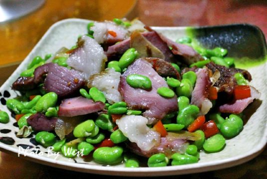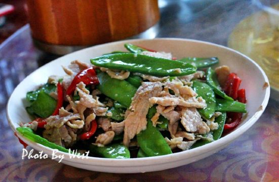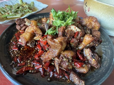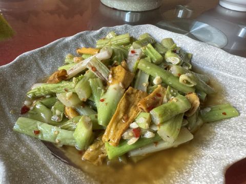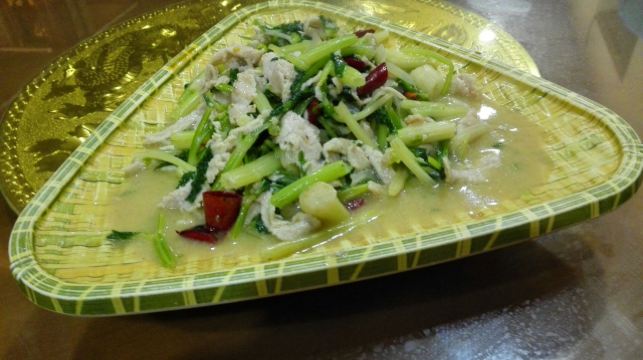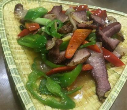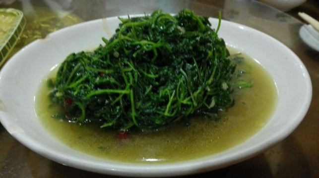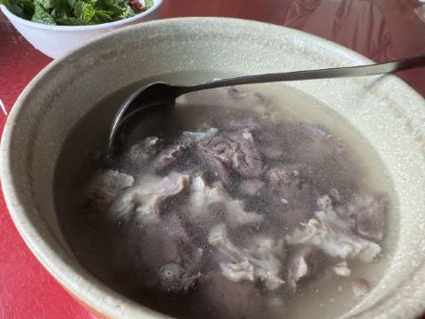 到红河元阳梯田旅行,住在多依树下寨的徊境元阳山居,一日随民宿老板一起赴其他寨赶集,然后就带到新街镇这家比较热门的饭店用午餐。饭店挺大,环境尚可,菜品也比较丰富,绿叶菜品种选择比较多。店里的招牌是猪蹄,点了此生首见的芋荷杆和清火专项苦瓜炒鸡蛋,另外在民宿伙计推荐下,在隔壁两个门面的哆啦唑饭店买了店里唯一的招牌清汤牛肉,妥妥舒适的一餐。元阳本地的土菜,新鲜美味,值得尝试。