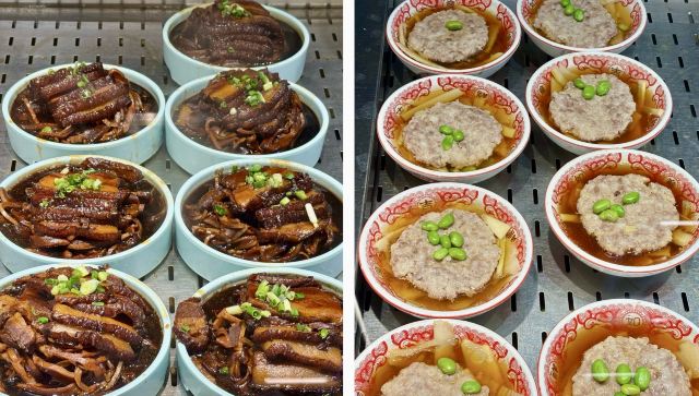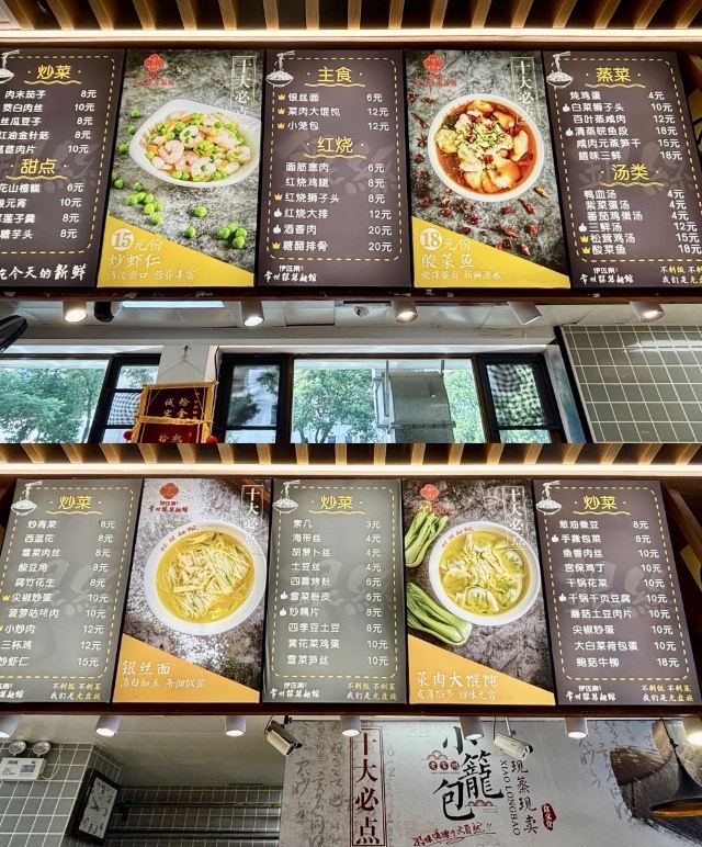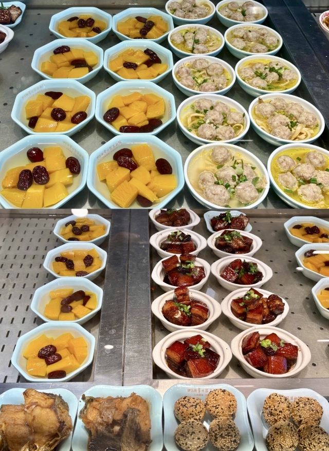 红汤银丝面,顶黄小笼包,糖醋小排,大排,红烧狮子头,豆腐汤,生煎包,面筋塞肉,米糊,大麻糕