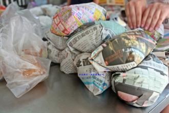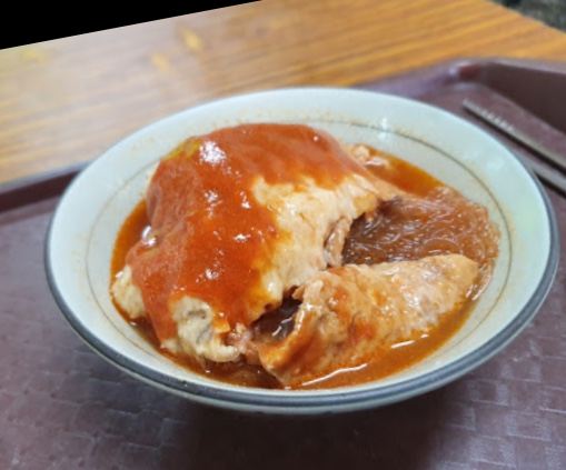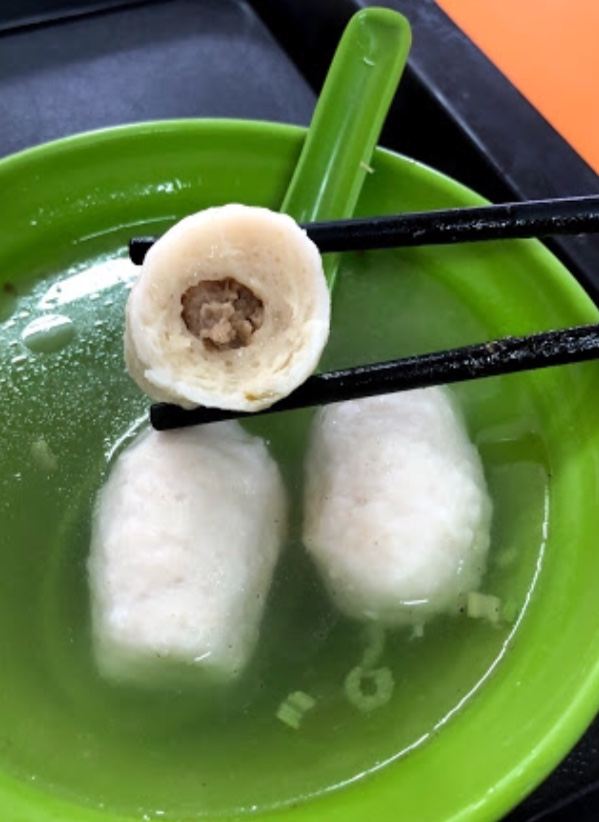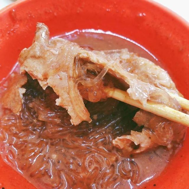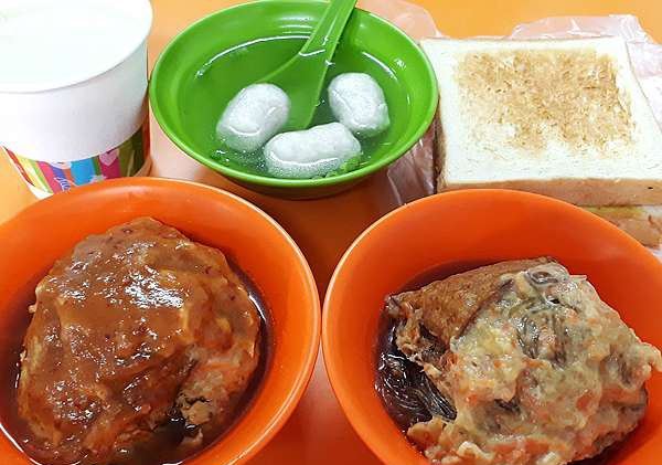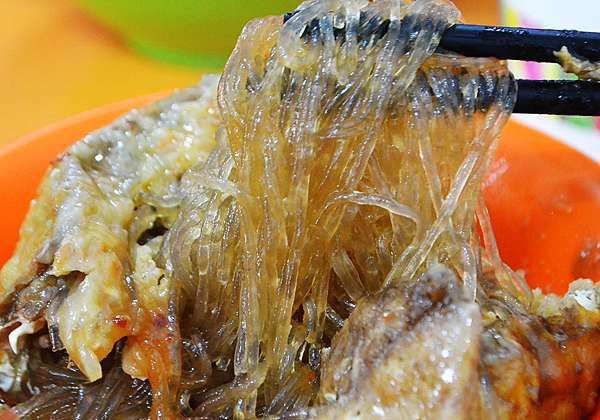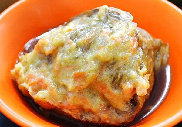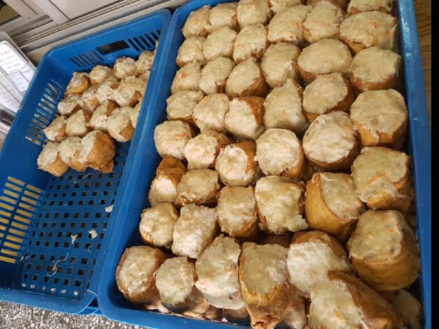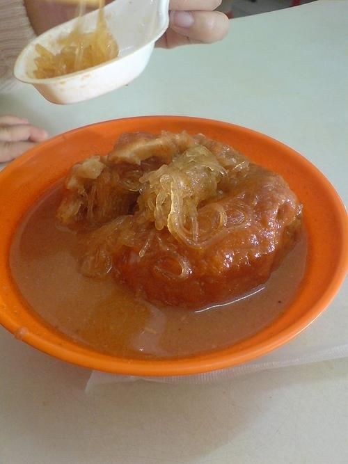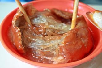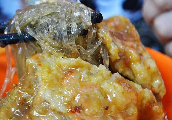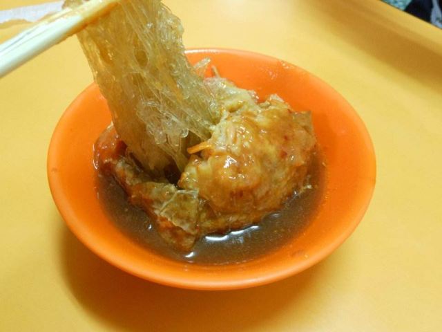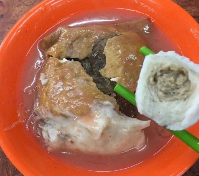 淡水真理街上有三间相当知名的阿给老店,而老牌阿给最有名。说到阿给的由来,店内墙上挂的清楚的说明:原来阿给是源自日文的油炸豆腐直接音译而来,将一块四方的油豆腐从旁挖空,填进炒过的冬粉(粉条),再用鱼酱封口,放进蒸笼中蒸熟,食用时再淋上特质酱料。 这里的 鱼丸汤一碗4只,椭圆形的鱼丸以打成浆的鲨鱼肉做成,中间包一点肉糜,也值得品尝下。
