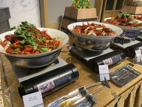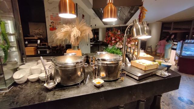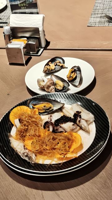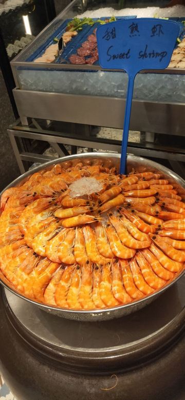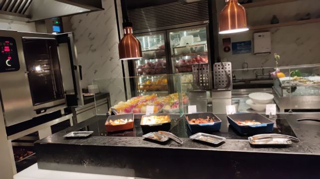 Air Chef Dining Restaurant,Double Tree by Hilton, Foshan-Nanhai和在线旅游、住宿平台合作的这酒店,在佛山市南海,除桂城街道,就是全区最高档酒店。哪怕算上桂城街道,在佛山市区和南海、三水,包括近顺德乐从的佛山新城区域,也能在豪华酒店列前七名。前六名是佛山宾馆和保利的三间五星级酒店、佛山希尔顿酒店、马哥孛罗酒店。 希尔顿逸林在希尔顿品牌次于希尔顿酒店,但已属五星级酒店,比华美达酒店档次都高。考虑到没过双桥路的荔湾区也少豪华酒店,应不少广州居民来体验。 位置好,从桂城瀚蓝广场开车14分钟,去广州荔湾区,17分钟车程。所在南海大沥是南海区高产出和个人收入大镇,且路段属佛山禅城区和南海区、三水区去广州荔湾区、越秀区、天河区最近公路。地理位置属于佛山和广州边界。 周边工厂、楼盘小区多,各类型批发市场和肉菜市场也多,附近又有和华180、嘉洲广场、金铂天地、广佛新地、雅诺广场等商场和众多酒店、餐饮、学校,经常车多人多,交通拥挤,属闹区。 相反,酒店外形设计独特,新颖、科幻,设计考量细致,酒店高,电梯上升,梯顶有屏幕显现天外景象,有升外太空感觉。家具和装饰有超越所在区现代感、豪华感,内空间开阔,是本区地标。毕竟临近建筑如威尔斯商业广场,无香港威尔士亲王医院、玛丽医院、玛嘉烈医院等大型医院的规模和知名度。 餐厅在52楼,却着力打造具岭南风情古典型象,走廓地板是古代灰瓦片侧面外观,既具防滑倒功能,又与集团下属和华180商场中仿古代岭南街市的商铺街风格相符。但卫生间虽防滑地面,有水在地,仍滑。 但实话,纯近代外观商业街区设计自香港瑞安房地产集团在上海和佛山祖庙操作成功,在全国各地都有大量仿效。酒店和商场要取成功,需大量后续投入。商场前任公司,曾非常成功运营过佛山市桂城凯德广场,我也识,没成功,现集团需更多后续外围装修和打动人故事。 餐厅设计非常成功,整整一层餐桌围绕厨房和食品陈列架的内环型设计,空间利用很充分。且餐费实惠,190块钱可靠窗欣赏整个大沥镇景色。可惜晚8点用餐,只见大沥盐步部分街景。 食物种类多,除雪糕以外基本任吃。西洋巨汉,没吃几天,来了也吃不完。光西式点心有很多款。餐厅厨师服务很好,顾客可自选食品和海鲜,让现场加工,会让吃不惯冷熟海鲜或原味海鲜的顾客满意。用蒸笼来保温,又很贴心用多一大底碟装盛食物,防顾客烫伤,是很有经验。设计明显讨好家庭用餐,有儿童设施和很多儿童食品。