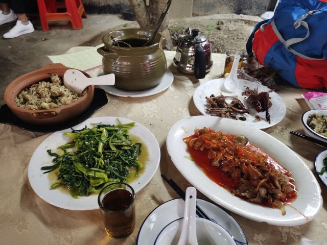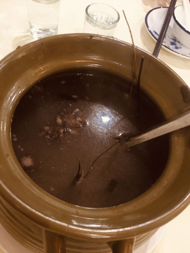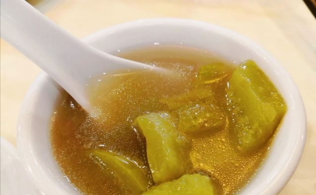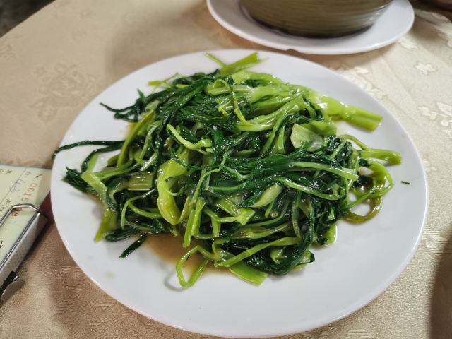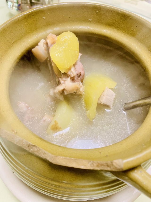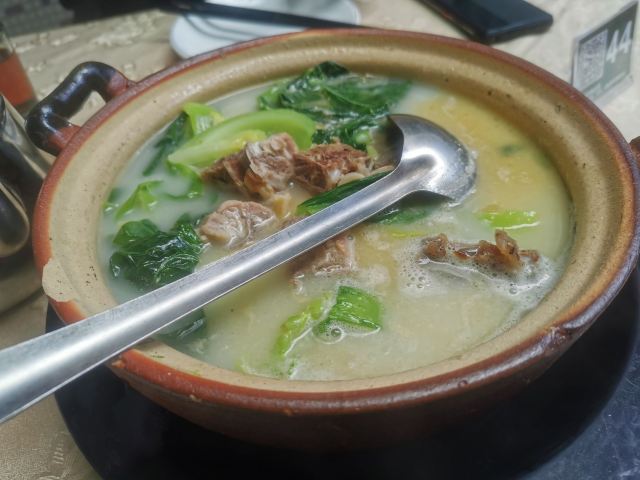 Cora菱角这是一个周末午餐需要多单拼桌依然还要等位的餐厅,有二楼有房间有露天还有一个小厅,但还是不够坐,我们算是比较幸运,刚好有一张双人桌。 两个人的菜不算很好点,一个猪手例牌38元,一个例汤18元,再加一份炒笋28元就足够,其他诸多菜式都只能看,没那么大的胃。 这里的白切猪手确实做的非常好,分了有骨和无骨两种,在其他餐厅也吃过白切,但是总会有点肥腻,这里的完全不肥腻,某些部位猪皮的口感居然会有点像猪肚,也没有过多的调味料,就是花生油酱油。 例汤是白瓜眉豆猪骨鸡脚,10碗左右,汤调味正好,不会过浓,两个人喝刚刚好。 蚝油沙口笋催了很多次才上桌,也不单只我们这一桌,很多桌都催青菜,差点都想吃完就埋单走了才姗姗来迟,不过这种笋确实非常的鲜嫩,纤维细腻,不涩。 买单可用支付宝和微信,服务水准参差不齐。