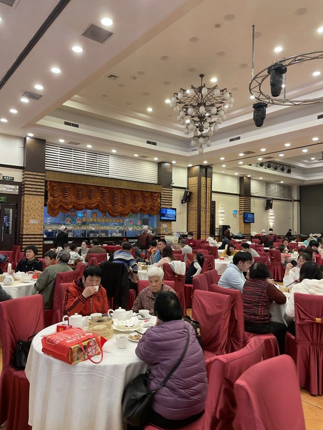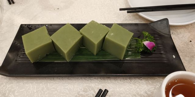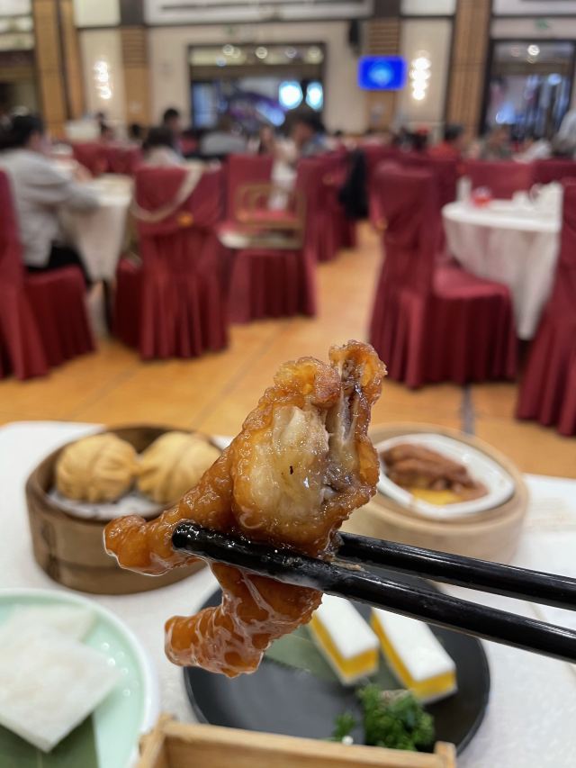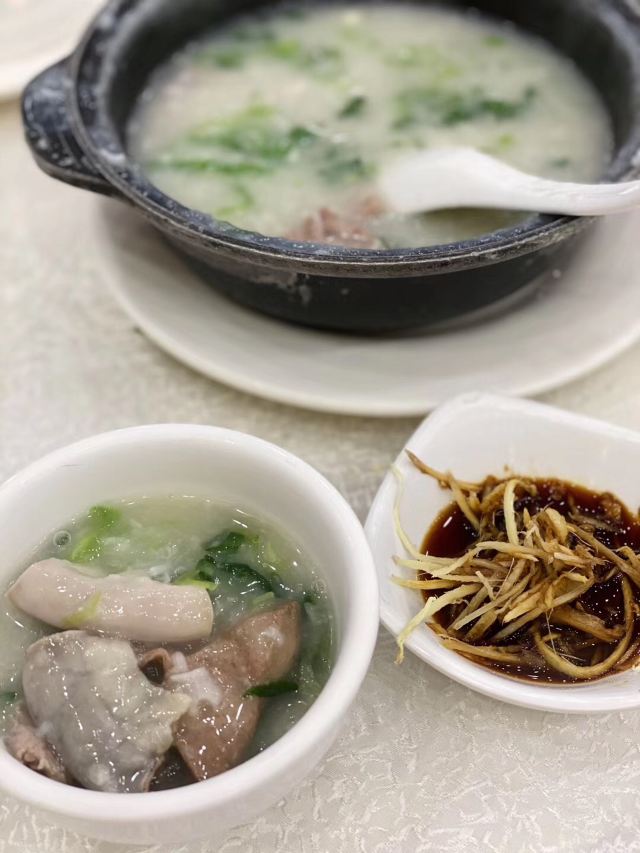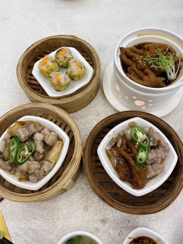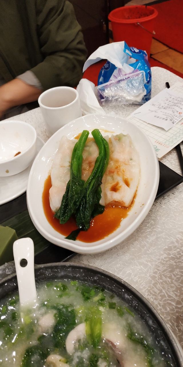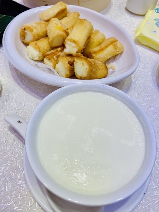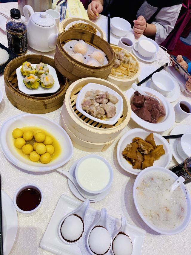 Yolanda_zy来顺德的第一餐,见识了地方早茶的壮观。没有预约,大概9点不到到的,已经是大堂少有的位可选。这里先点茶后服务员给自助卡单,拿着卡自选茶点,轻点敲章后,拿到自己桌享用。全自助形式,可多次拿取,每次会有些不同的点心,根据后厨的出品情况决定。正巧阅兵式,大家早早拿好茶点,坐下慢慢吃慢慢看。给我总统感觉,品种丰富,味道还是普通,没有想像中美味。陈家粉也就是淡淡的,因为排骨的香油渗入,才有了一点味道。虾饺皇都是一直蒸着,所以吃口不是特别好,有种煮过头感觉,还是喜欢现点现蒸的那种。炸鲜奶是当地特色,可是特别甜,油腻,不适合多吃,配上茶可以吃一两块。猪血倒是出乎意料的嫩,好吃。一餐最让我记住的还是姜撞奶,甜度适中,滑滑嫩嫩的奶香十足。