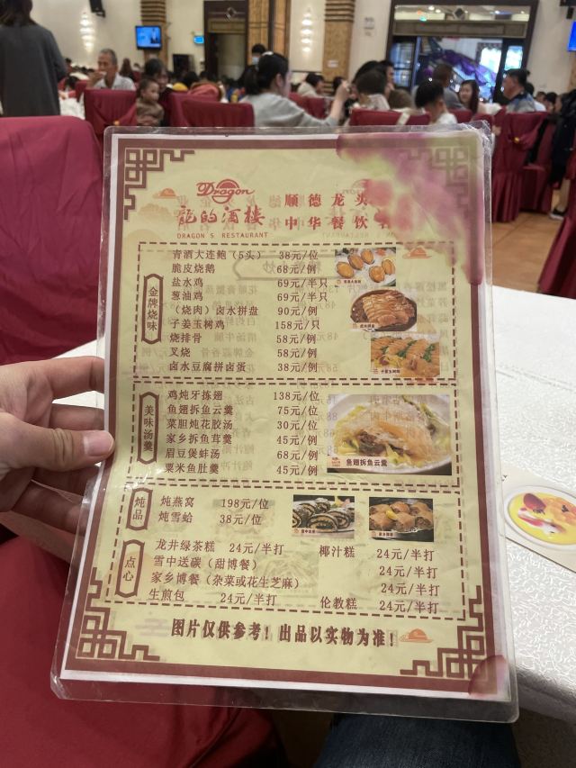 DRAGON'S RESTAURANT到了顺德还是吃一顿当地大型酒楼,觉得好老式的感觉。燕奶金丝球和煎焗鱼嘴我很喜欢,花胶瑶柱炖菜胆的汤不错花胶品质一般,鲍汁扣鹅掌为何鹅掌是酥皮的我不太懂,古法彭公鹅居然是近似我们川菜鱼香味型,煎包现做很新鲜。顺德大良近良路6号。