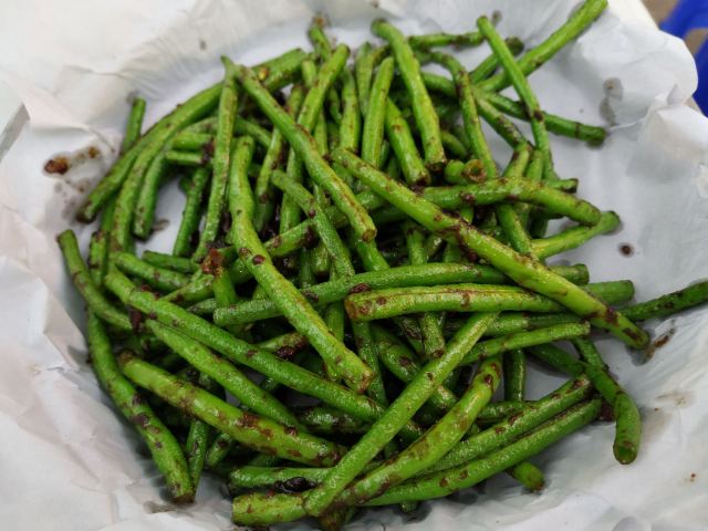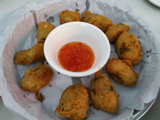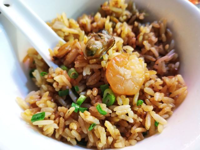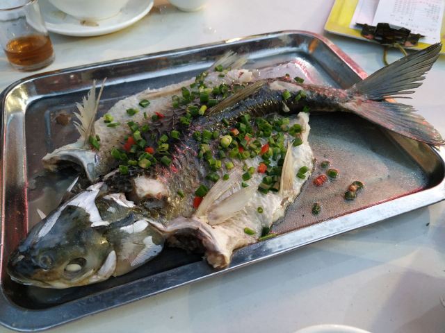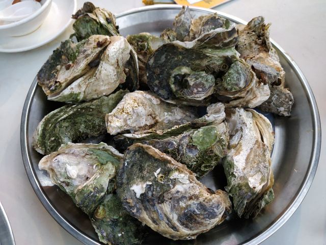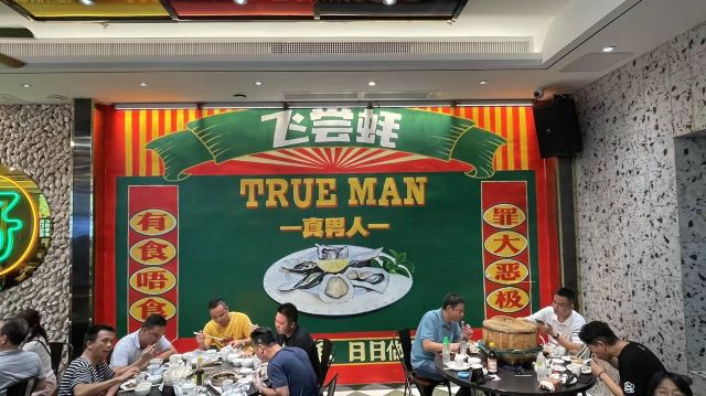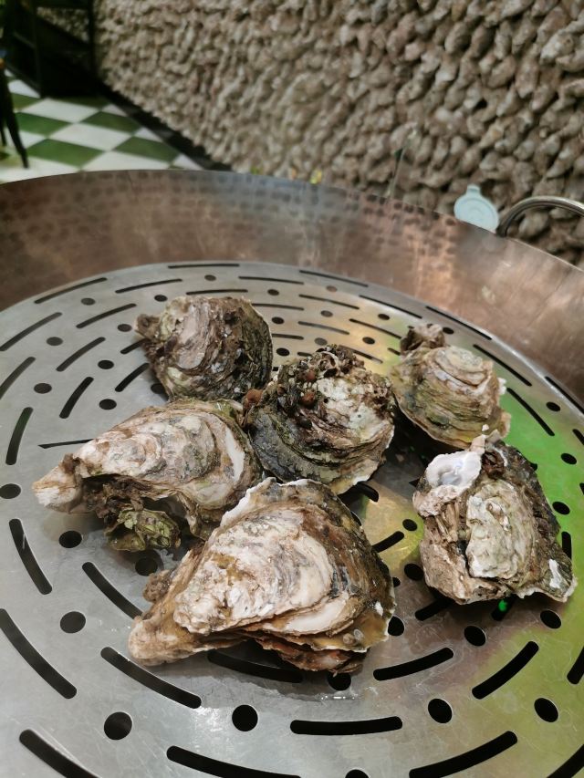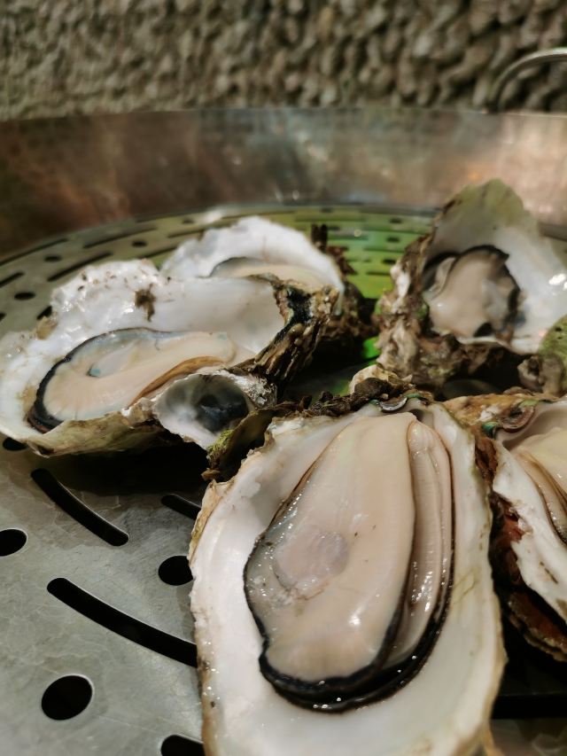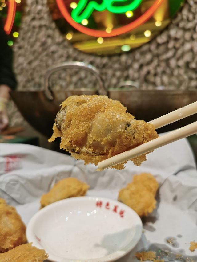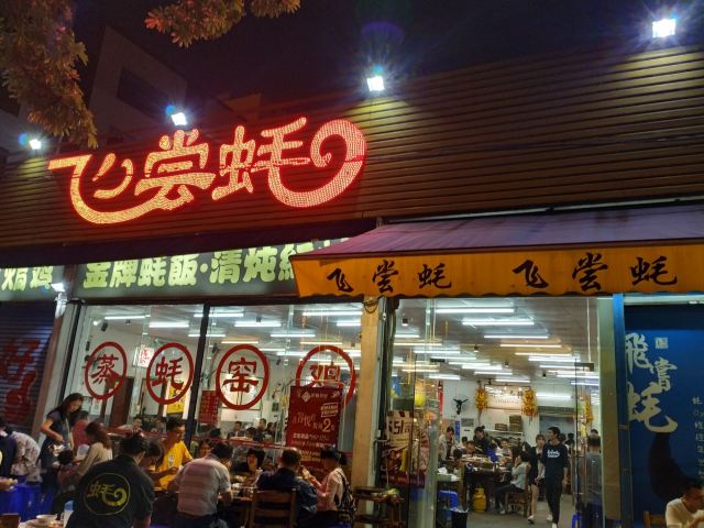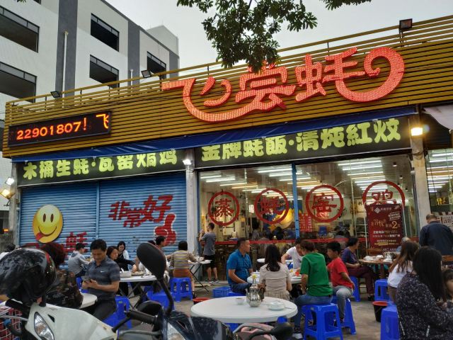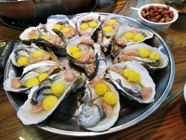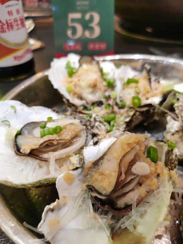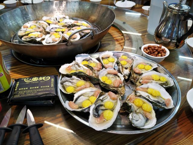 芳芳Flora[2019-05-03]我们在顺德游玩,将近晚餐时间,就导航去这家“飞尝蚝”,因为亲戚听到他朋友的介绍,说这里吃蚝不错,于是我们就来试试了。来到店门前,在路上窄窄的划线停车位上把车停车,刚刚好剩下最后一个车位,我们庆幸来得还算及时,要不然比较难找停车位了。看到门外的露天桌子已经坐了不少的客人,亲戚们走进大厅去找位,被告知大厅已经全被订了座,只能走回到门外的露天位。那种木桌面、中间有煤气炉的桌子已经全坐满了人,服务员拿了两张塑胶圆桌拼起来给我们。看到附近的客人都点了那种木桶蒸蚝(大大的圆形铁锅,上面盖个很大的木桶作为锅盖),我问服务员,我们坐这种桌子,是不是就不能点那种蒸蚝了,服务员答道,蒸好了再端上来给你们。亲戚们走到大厅里点菜了,点了6个菜和一个焗饭。(1)蒸大蚝,一打108元,端上来后,我们发现蚝的上壳还未开的,服务员给我们一把小刀,让我们自己开蚝。蚝肉挺鲜甜的,里面的汁水也很鲜美。我们看到附近桌的蚝都是有小小鹌鹑蛋的,而我们的没有,打开就只是蚝肉,问了服务员才知道,原来那种是不同的,她告诉我们下次来,要指明点那种188元的,才是有鹌鹑蛋和鸡子的,亲戚们倒是觉得幸好没点那种,因为大家都说不吃鸡子的,哈,我们想着下次能否点个只加鹌鹑蛋的生蚝。不过看着别人桌上的“鸡子+生蚝+鹌鹑蛋”的色泽真的很漂亮,我也忍不住跑去拍人家桌上的菜了,那时大厅里订了桌的,人还没到,漂亮的“鸡子十生蚝十鹌鹑蛋”已备好了在桌面上。(2)三水冬瓜鱼头汤,38元,好大的一盘汤,冬瓜挺甜的,鱼头也很鲜美,大家都爱这个汤。(3)酱爆豆角,30元。豆角挺爽脆,不错。(4)酥炸生蚝,68元,外胸内嫩,肉汁鲜美。(5)山坑鲩鱼,60元。鱼肉好滑,好鲜甜,好好吃。(6)白饭鱼煎蛋,58元。(白饭鱼48元,附算加煎蛋10元)白饭鱼不多,蛋煎得有点老,这个一般般。(7)金牌焗蚝饭,48元。很大个瓦煲端上来,里面的饭不算多,但是瓦煲只是盛器,饭并不是用这个瓦煲来焗出来的,旁边桌的客人也专门来问我们是不是觉得这个不像焗饭,哈,他们说摸着瓦煲发觉煲是冷的。虽然不是原煲的焗饭,不过也挺好味道的,里面很多蚝仔,也有几个大蚝肉,还有虾仁的葱。挺好吃的,大家都吃得很回味。有机会还要再来这里试试其实的菜式,而且下次得提前订座咯。