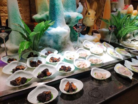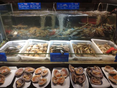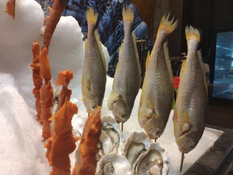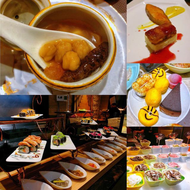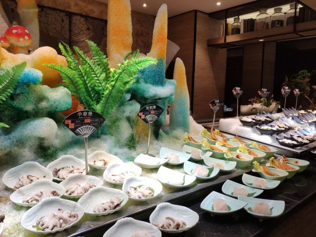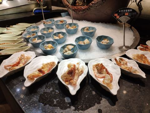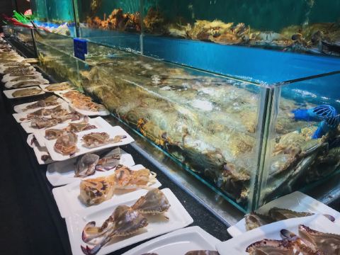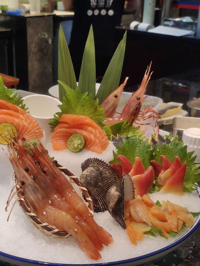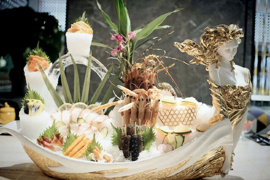 蒜蓉粉丝蒸扇贝,牡丹虾,东星斑鱼姿造,象拔蚌姿造,挪威三文鱼,阿拉斯加帝皇蟹,新西兰鳌虾,哈根达斯,龙虾刺身,生吃海胆姿造,冰鲍,日本雪花牛肉粒