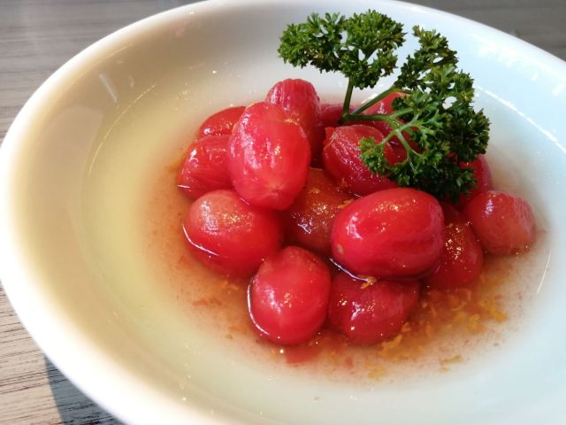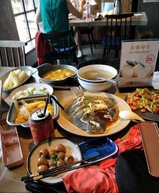 茉莉的甜品时光上屿水产小海鲜餐厅(马约翰广场店) 坐标:中华路4号之2,马约翰广场旁边。 环境:一楼海鲜池,二楼就餐区,有包间和大厅,还有露天餐区。 装修风格闽南风,想看古早味闽南印象,就可以来这欣赏下。 电话机,小电视机,暖水瓶还有缝纫机等。。。 服务:可扫码点单,很是方便,服务员态度不错。 菜品: 洒渍桂花蜜番茄:18元 冰爽入口,有点淡淡的桂花香,去皮的小番茄,酸甜可胃。 白灼本港鲜虾:58元 白灼吃出虾的鲜甜,虾很是肥美,虾肉Q弹,沾着酱油吃,好甲。 台湾山苏炒猪颈肉:48元 山苏叶比其他青菜厚些,更有口感,猪颈肉略甜,相对于肉来说,我觉得这山苏更好吃。不信你来试下? 石橄榄鲜肉汤:18元 很是清爽的汤品,石橄榄有清肺生津的功效,很是解暑气。 南洋凤梨饭:48元 一看到南洋两字,就想到咖喱,两人食份量略多些。米饭里还有去壳的虾肉,凤梨,胡萝卜等,米饭软硬适中,很好吃。 这里的环境很赞哦,适合宴客聚餐,服务又佳。