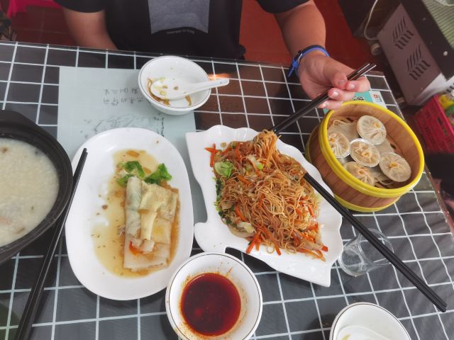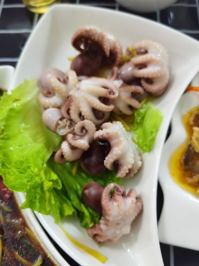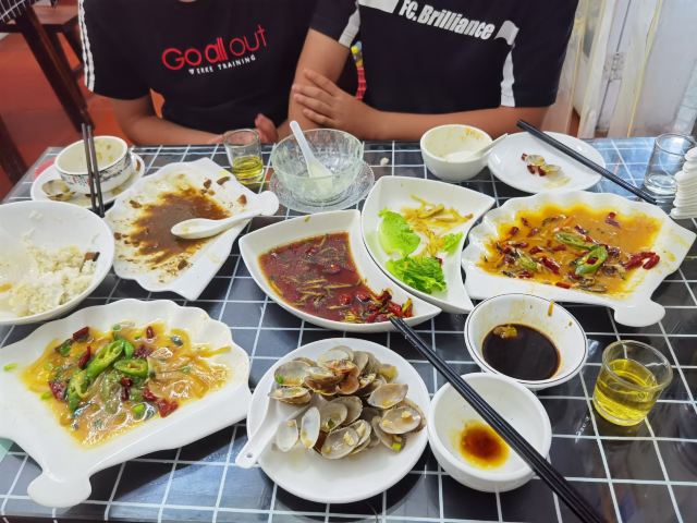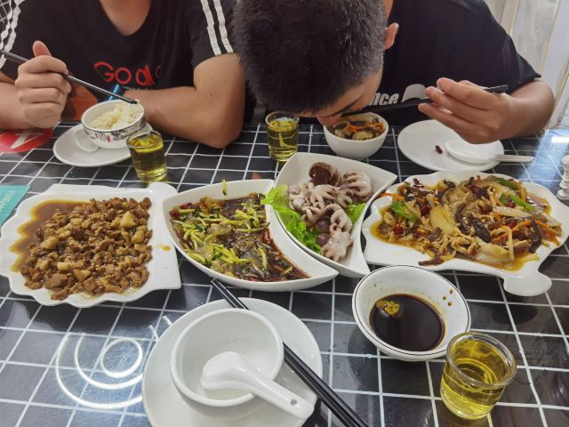 清蒸黄花鱼,手工鱼丸汤,海鲜沙茶面,香芋排骨,鼓汁排骨,石码五香卷,墨鱼小丸子,清炒时蔬,水头紫菜蛋花汤,海鲜肠粉