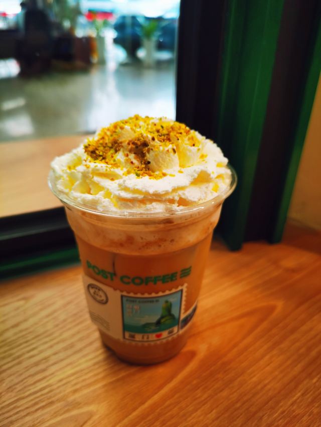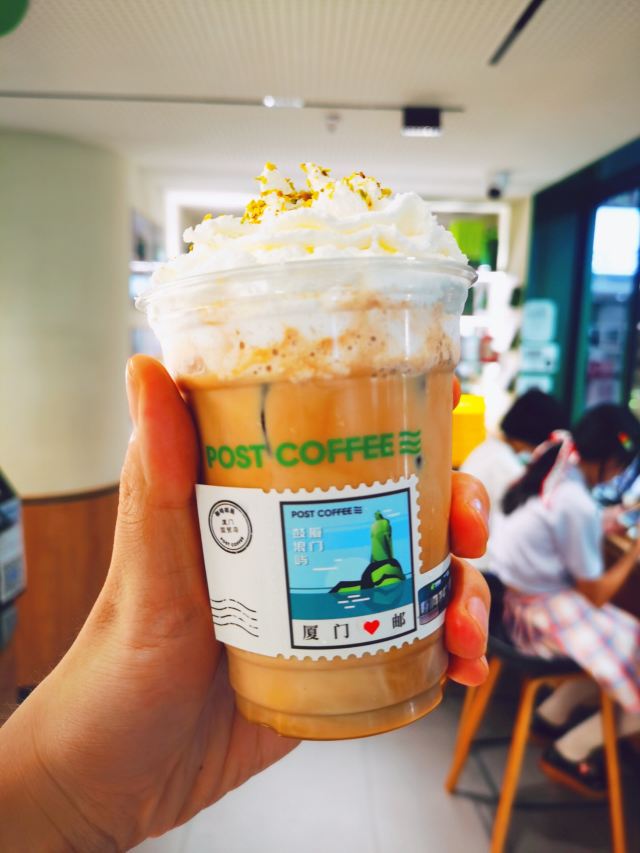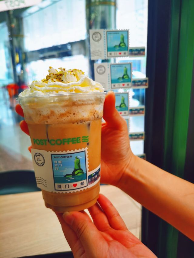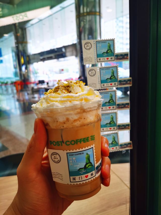 厦门美食|在邮局里喝咖啡 🏠邮局咖啡(国贸店)位于湖滨南路388号厦门国贸大厦一楼,依托原先邮政服务场所,将百年邮政与咖啡业务跨界结合,改造成一个可以社交、品尝咖啡,体验邮政文化的全新场景😯。 📭咖啡店墨绿色邮局风的门头、标志性的邮筒以及贴着邮票风标签的咖啡杯带给我满满的中国邮政元素,很有复古风和怀旧风👀。店里售卖品除了咖啡、茶饮、甜点之外,还有不少邮局周边,我最喜欢的周边是虎爪杯🐯,造型好可爱。店里常见的咖啡种类比如美式、拿铁、卡布奇诺都有,还一些自创的新品。 ☕邮点硬核:邮局咖啡的新品,👀奶油顶+开心果碎,底下是糖浆+牛奶+咖啡液。这是一杯奶味甜味比较浓郁的饮料,甜度在瑞幸夏末海盐和星爸爸的太妃焦糖之间。以龙舌兰soe为底的饮料很适合冰饮,伴着奶油一起喝还有点百利甜拿铁的味道,奶油顶感觉就是常规的香草奶油,咸甜口👍🏻。咖啡里的糖浆太抢风头,偏甜,甚至盖过了奶油的甜度。同样是邮局的坚果咖啡,我会更喜欢好事花生一些👏🏻~ 🏠咖啡的价格在20-30元之间,在邮局喝咖啡真有趣。