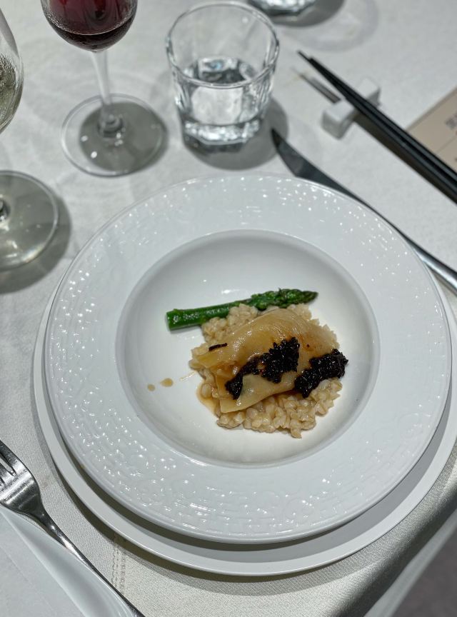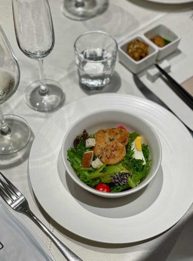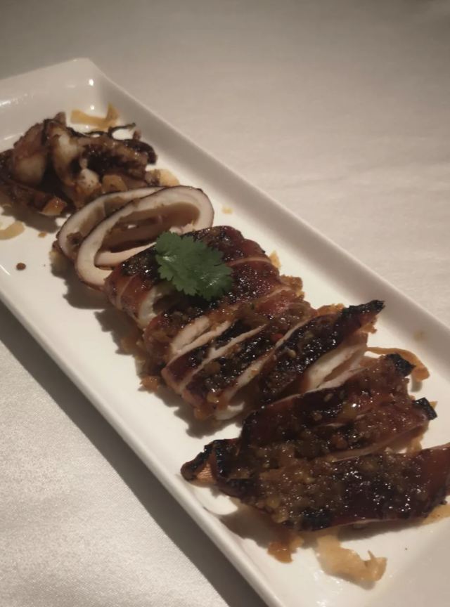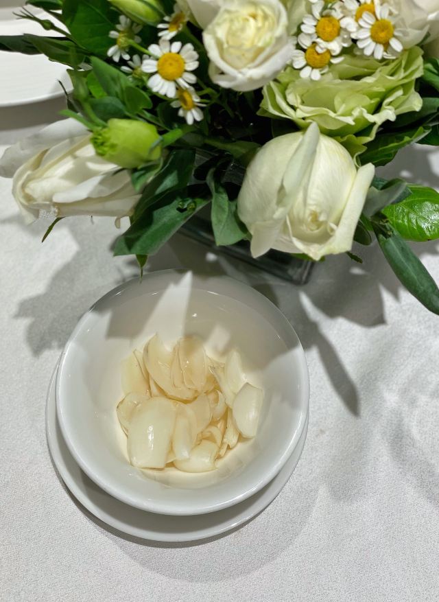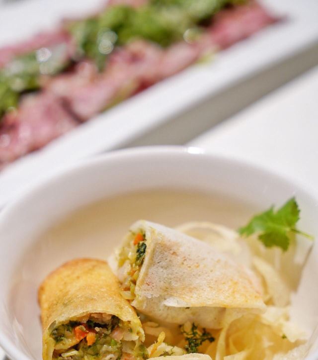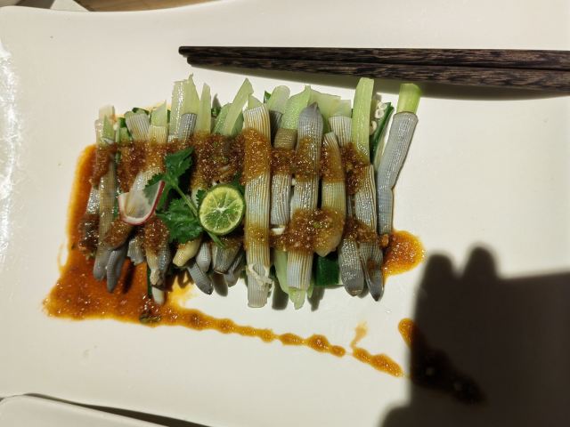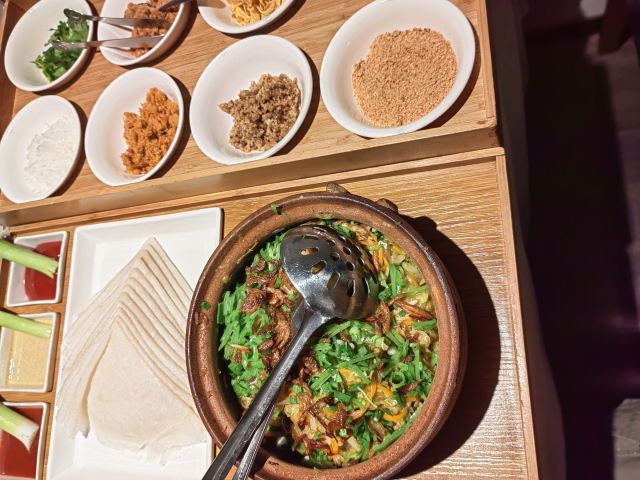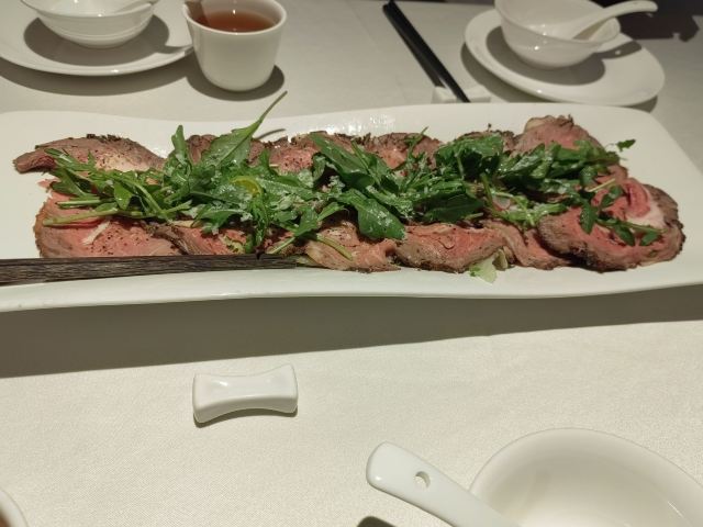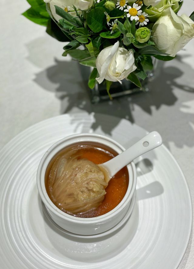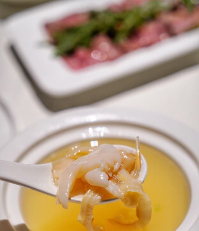 Miss丶Fiona【黑明·越界食尚】位於湖濱南路57號金源大廈1樓,原本的【融繪魚肆】,如今品牌升級,環境和以前相比是沒有太大變化,餐品變為跨界融合料理,保留了之前的部份菜品並在此基礎上有所提升。老闆兼總廚就是經常出現在廈門電視美食節目裡的介紹如何挑選好的原材料和菜品做法的知名大廚。 沙蟲拌秋葵,沒錯,沙蟲就是廈門特色小吃之一土筍凍裡面那個一條一條的令很多人害怕的不明生物。在沙蟲體內塞入一小根蘆筍,再擺放在切好的秋葵之上,淋上芥辣味鮮香醬汁,吃起來口感爽脆,很適合做餐前開胃涼菜。 廈門薄餅,一端上來就被驚艷到了,可以稱之為五星級豪華薄餅了吧,薄餅又稱作春卷,是廈門的地道美食小吃之一,我外婆做的薄餅也是吃過的人都讚不絕口。廈門薄餅的餅皮是一絕,菜色是用高麗菜絲、胡蘿蔔絲、冬筍絲、五花肉絲、豆乾絲、荷蘭豆絲、蝦仁、海蠣等等十二種食材混合大鍋熬製,配上八色配料:蔥白、芫荽、炒海苔、貢糖、蛋絲、肉鬆、魚鬆、米粉鬆,以及三種佐料:廈門辣椒醬、黃芥末醬、番茄醬。可以根據自己的喜好按照一定的順序自己動手卷起來吃,配料豐富,味道也是一級棒。 酸湯雪花魚,看到這道菜有團購,58元新客立減20元,相當於才38元,滿滿的一大碗,分量十足,有魚有肉,湯汁酸爽。 低溫慢烤牛肉,牛肉看起來紅紅的,大家還以為是生的,經過大廚的詳細介紹才知道其實是全熟的,要經過複雜的工序,長時間烹飪,才能達到這樣的效果,這樣的牛肉肉質特別鮮嫩。 雞湯貴妃蚌,貴妃蚌盛裝入碗,倒入滾燙的雞湯,吃起來如舌頭般滑嫩,鮮甜無比。 豬油拌飯,記得小時候,媽媽要是來不及燒菜,就會去盛一碗熱氣騰騰的白米飯,舀一小勺豬油,加在米飯上,米飯的熱氣,將豬油融化,再加上些許醬油,攪拌均勻,香氣撲鼻。多少童年的回憶瞬間湧現而出。