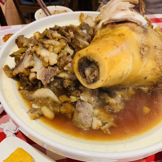 几乎每次来都是人山人海,门口全是人。今天11点多来,依然要拿号。菜品似乎挺稳定的,主打各种牛羊肉。点了牛棒骨,三斤多的量,剃好肉的,吃起来省事,卤得味道恰到好处。其他菜依然点了每次都吃的面筋,蘑菇汤攸面鱼鱼,好吃。