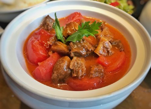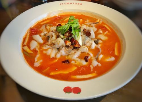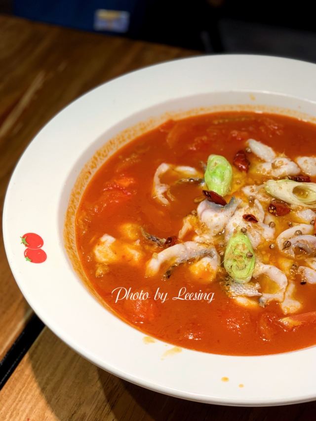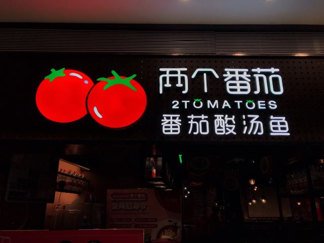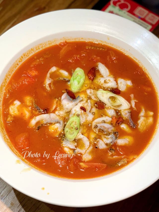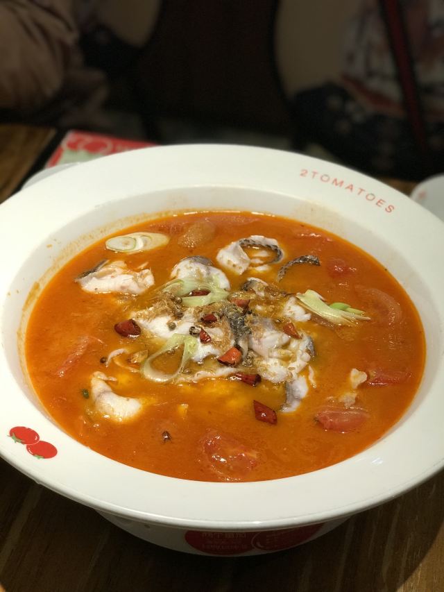 一直在路上的猫厦门创新川菜|一锅番茄鱼征服我 川菜,以麻辣为主。两个番茄将川菜经过了创新改良,店内主打的番茄鱼,选用贵州野生小番茄自然发酵出酸汤,配以农夫山泉水和猪骨汤,汤汁浓郁,鱼片滑嫩,酸爽开胃。另外店内其他创意川菜也是不容错过。 环境以可爱的番茄图案为主打,番茄红的色调,番茄的玩偶,店内服务员穿着可爱的番茄服装,都让人眼前一亮; 餐品: #番茄鱼V2.0# 在原有的番茄鱼基础上加大了份量,超大一盆,鱼肉嫩滑,酸汤酸爽适口,特别是里面的粉丝,浸满了酸汤,入味好吃; #椒麻跳跳蛙# 田鸡个大肉肥,紧实细嫩,独特的椒麻做法,椒香麻辣,吃起来很爽,里面配以丝瓜和海木耳,丝瓜本是无味的素菜,但因吸收了椒麻汤汁,竟然一点也不输给主角田鸡; #手工水煮肉片# 这是经典的川菜,不同于普通的川菜馆,汤汁在辣度上减弱,但是更加鲜香,肉片大而薄,吃起来很香嫩; #铜桶钵钵鸡# 类似于冷锅串串,里面有皮Q肉嫩的鸡腿肉片,有韧性的牛肚,脆爽的藕片和莴笋等,撒了白芝麻,非常好吃; #鸡蛋碰石头# 非常有创意的菜,石锅内铺了鹅卵石,烧到高温,现场打入鸡蛋,搅拌鸡蛋至熟,外酥里嫩; #番茄牛腩# 肥瘦相间带点筋的牛腩肉,经过酸甜的番茄的加持,更加激发出牛肉的香,石锅下小火慢慢加热,番茄越煮越浓厚粘稠,这个汤汁拌饭酸甜滑嫩,太下饭了; 还有香嫩的酥肉,鲜甜的黄金虾,软香甜糯的红糖糍粑。每个菜都好吃,水果-小番茄自然必不可少,小食-锅巴香酥脆、米饭-精选好米好锅煮制你值得拥有,以上都是自助的,无限量自取;性价比高; 服务员服务热情,亲切可爱;很满意的体验。