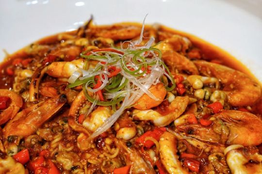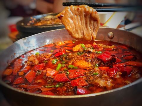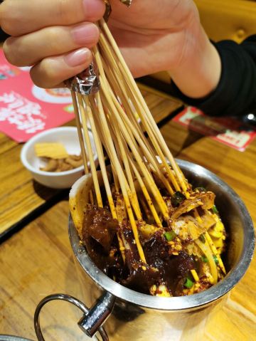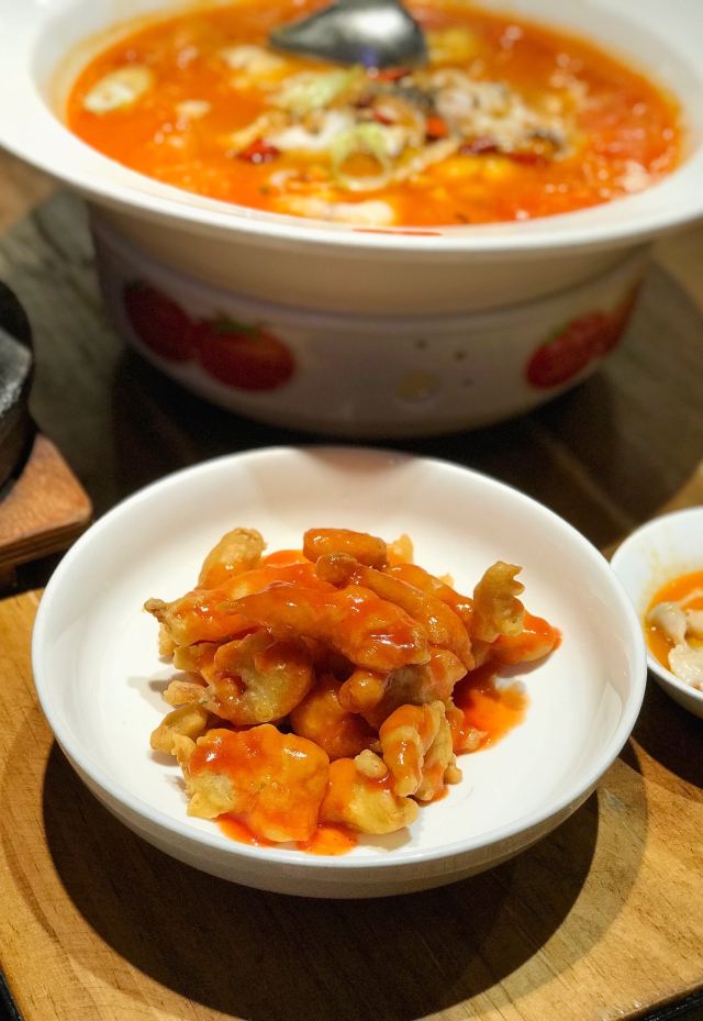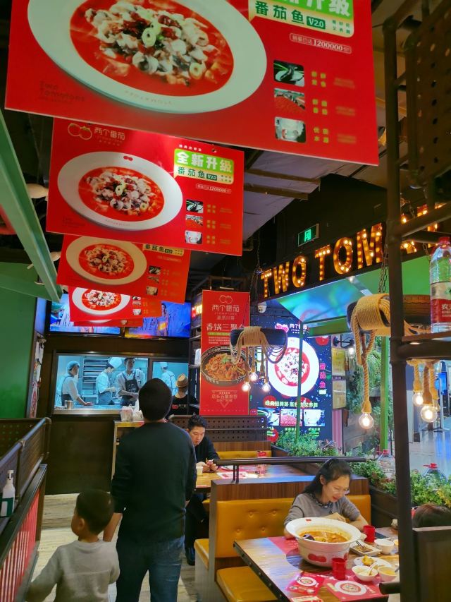 加州广场三楼的两个番茄酸汤鱼门店,我感觉是比其他门店来得好吃的。大红色的基调,视觉上很亮堂,用餐环境也比较舒心。有自助的水果小吃,比较贴心的。|番茄鱼V2.0^鱼刺还是比较少的,吃起来会比较放心,酸酸甜甜的也比较下饭,汤底有点油,直接喝的话会略微腻,浇饭还是很不错的。|钢桶钵钵鸡^钵钵鸡味道最好,荤素都有。|网红咖喱辣子鸡^不是很呛辣的那种,鸡肉挺嫩的,不会柴。