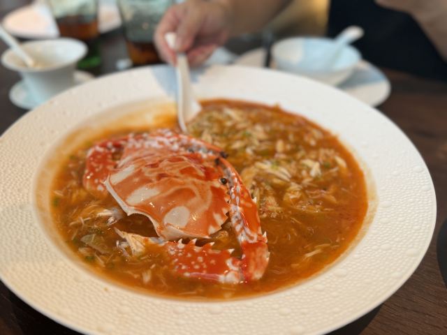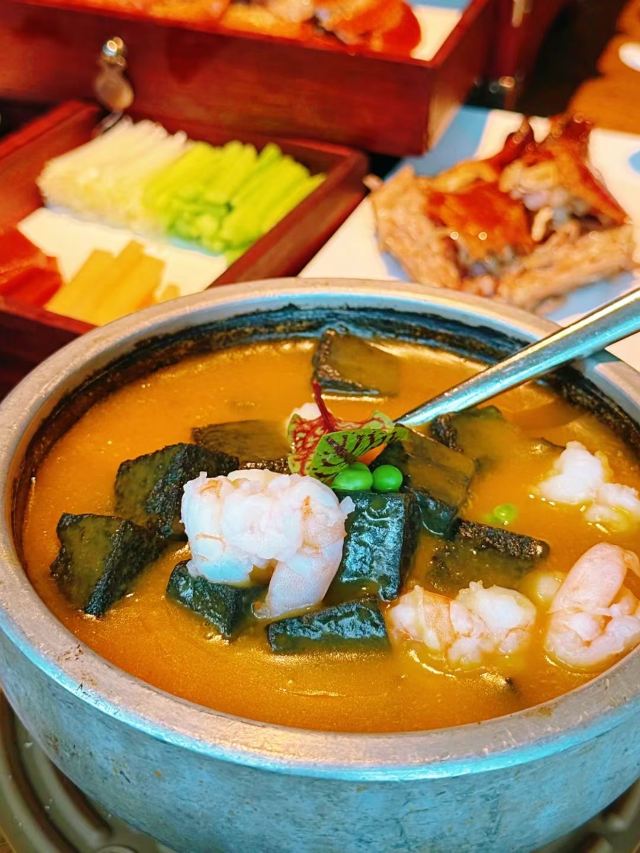 一直在路上的猫厦门探店|上饍冬日甄选|香浓的羊肉汤暖身暖胃 👉【特色】以“尽善尽美,闽粤融合”为为品牌理念,主打地道闽粤菜,各款山海鲜食。根据季节推出不同主打菜系,招牌烤鸭每桌必点。 📍地址:环岛东路JFC品尚中心B馆4楼。 🕐营业时间:11:00-14:30,17:00-21:00。 🏝环境:高端大气上档次。暗色调使人放松。就算是二人座也很宽敞,皮质沙发坐的十分舒适。 🍽【推荐美食】: 🛎 #滋补鲨鱼丸羊肉汤配油条# 冬季推出的新菜之一。以小火锅方式呈现。肥而不腻带皮的东山羊肉,闽南特色的鲨鱼丸,想不到二者搭配激发出独特的味蕾体验。汤奶白香浓美味。羊肉蘸点搭配的腐乳酱汁特别好吃。鲨鱼丸劲道Q弹。还有丰富的配菜,白萝卜、淮山、玉米等,饱吸肉汤,也格外美味。 油条是现炸的,端上来还热乎乎,会贴心帮忙切成小块,趁热赶快单口吃一个,酥香脆。亦可泡羊肉汤吃,吸了满满的羊肉汤,太美味了!推荐必点,寒冷的冬日一吃就暖和起来的菜。 🛎 #杏香烟熏带鱼卷# ✨不看菜单我根本看不出这是带鱼卷,摆盘特别惊艳。带鱼去了骨炸的外酥里嫩,蘸点糖霜,既有海鲜的咸香又有蜜汁的味道,丰富的口感我很喜欢。 🛎 #油醋有机小瓜丝# 开胃凉菜,酸甜度把握得恰到好处。瓜丝非常脆嫩。 👍服务非常好。从进门就感受到五星级酒店般服务。还有赠送餐前水果和点心。在这里吃饭是一种享受!