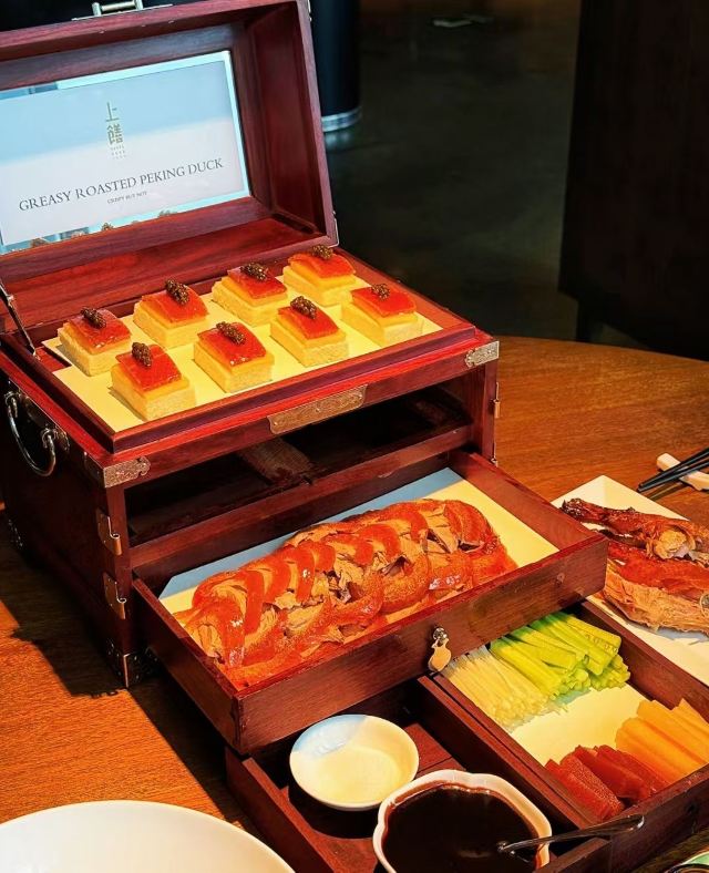SHANG SHAN ·ZHONG GUO CHU FANG(JIAN FA JFC PIN SHANG ZHONG XIN DIAN)上饍.中国厨房位于建发大厦JFC品尚中心B馆4楼,位置挺好找的,交通便利。商务宴请、家庭聚会、朋友欢聚选这里都不会错,菜品有档次,环境也不错。招牌鱼子酱烤鸭是必点之一。上桌前的切片仪式感满满。最近又又又上新菜了,有机会一定会去品尝一下。 服务: 不管是门口的迎宾,上菜的小姐姐或者收银台都很耐心,有求必应,服务的很及时。