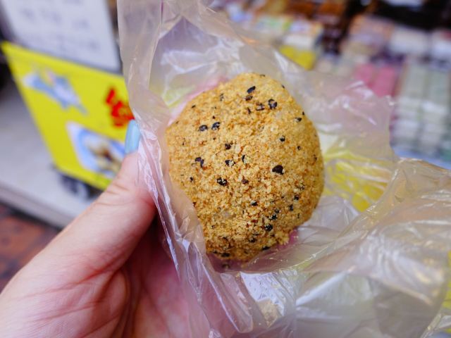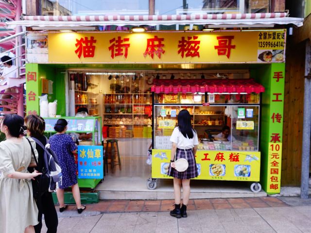 《必打卡,渐行渐远的古早味》 何曾几时,猫街最好吃的麻糍店---猫街麻糍哥,成为逛顶澳仔猫街的必打卡点。 猫街是一条并不宽大的街道,也不会很长。虽然不是说有很多真的猫,但这里确实是以“猫咪”为主题的街道。猫街麻糍哥就在“厦门猫街博物馆”路口,招牌也很显眼。看到店门口两两三三都在买,忍不住驻足观看店主娴熟包麻糍的手艺。 它们家的麻糍有三种,1招牌脆脆2花生芝麻馅3纯糯米。馅料有两种选择:花生芝麻或者蛋酥。可以整盒买,也可以单个买,真的好吃也不贵,两块钱一个,10块可以买到一盒,性价比很高。 麻糍,一种是将糯米用冷水浸过放到蒸笼里炊熟再舂成米团,另一种是糯米浸过之后直接磨成米浆沥干后炊熟。 买了双拼,都是现做的,那种层次,那种质感,一定要当场吃。麻糍一口咬下去,外皮软糯,里面的蛋酥框框掉渣,好吃到nice。黄豆花生粉在外,薄脆加酥糖在里,中间用麻糍过渡;一口下去,香,脆,糯,还带着拉丝的效果;甜度刚刚好,不会腻,不会干巴巴喷粉。爽脆的口感很多人说有点像煎饼果子的内馅,但又不尽相同。麻糍特别香,糯糯的,是那种甜而不腻的麻糍,而且很顶饱。 店里还摆满了其他传统美食,除了麻糍,还卖艾草糕、紫薯糕、麻枣,QQ串,绿豆糕...... 两块钱的快乐,这个性价比无敌了,一个刚刚好。对啊,我没说错,就靠这个2块钱的麻糍! 小贴士: 猫街麻糍哥 地址:厦门市思明区思明南路400号(顶澳仔猫街猫街博物馆门口) 人均:麻糍2元/个 时间:10:00~20:00 推荐指数:五星 推荐美食:脆脆麻糍