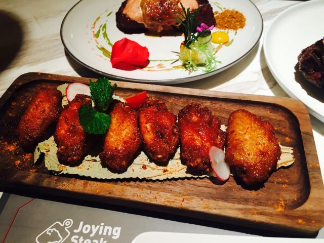 钟意牛排,一个很好听的名字。 在厦门有两家店已经开三年多了,国贸中心店位于湖里银泰百货三楼,看到好评如潮,就选择了来他们家。 [环境]餐厅装饰大气且有情调,整体是工业风格的设计,公开透明的厨房,大堂宽敞明亮。 每桌之间间隔很大,保护客户间的隐私,桌上都有鲜花和红酒,精致又浪漫。 除了环境给人赏心悦目以外,最重要的当然还是菜品啦。 西餐讲究的是仪式感,红酒也是必不可少了。 「智力赤霞珠红葡萄酒」 该酒外观呈明亮生动的红宝石色,森林浆果和香料的精致香气弥漫在皮革和甘草的丰厚香气之上。 「烟熏鸭胸沙律」 淡淡的烟熏肉味,搭配新鲜爽口的蔬菜和水果,淋上油醋汁,味道挺不错的且开胃。 「风味鸡翅」 店铺的招牌菜色之一,看似普通的一道菜,但厨师将它做得外皮酥脆,里面娇嫩多汁,味道让人赞不绝口。 「泰汁黑虎虾」 非常泰味的一道菜,新鲜的黑虎虾,肉质Q弹,独特的香料味,再挤一点柠檬汁,很是不错。 「海胆鲜虾汤」 搭配有海胆、鲜虾和菌菇等,倒入浓浓的南瓜热汤,搅拌一下将材料的精华融入其中,味道鲜美至极。 「肩胛牛扒」 厦门牛排第一名,点的是七成熟,火候把握的刚刚好,肉质嫩滑细腻且富有弹性,足够厚实的一大份牛排,满足了大口吃肉的快感,嚼劲十足, 「香草慢烤草原羊胺」 七成熟的羊排肉质柔软,不带一丝膻味,细细品味,羊肉的甘甜还带着些许肉汁,非常的嫩。 「果木炭烤黄花鱼」 大黄花鱼烤的火候刚刚好,色泽金黄,鱼皮酥脆,鱼肉鲜嫩。 「榴莲黄金芝多士」 对于钟爱榴莲和芝多士的人来说,简直是最佳的甜品了。金灿灿的芝多士,口感松软,蘸上炼乳,回味无穷。