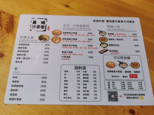 招牌鲍鱼沙茶面,鸡肉卷,面线糊,海蛎煎,卤肉饭,花生汤,海鲜粥,特色海鲜沙茶面,素食沙茶面,经典沙茶面,油条,沙茶面,晨曦花生汤,沙茶面底