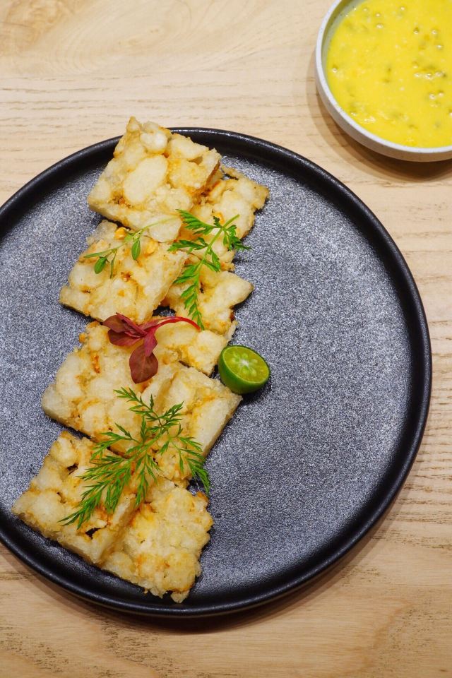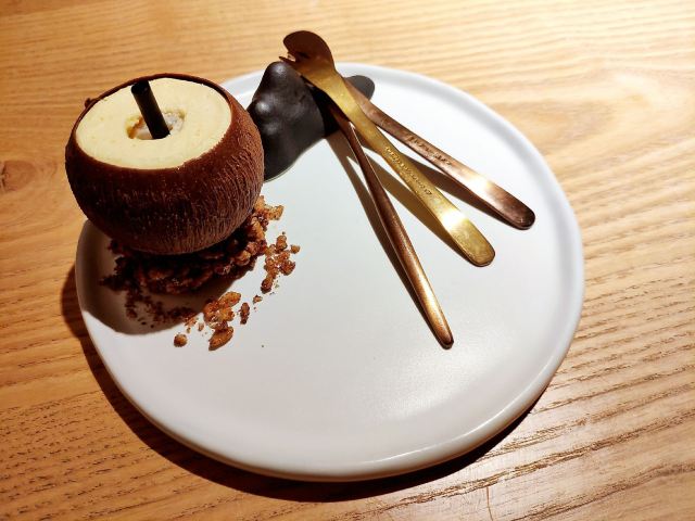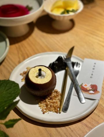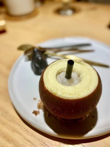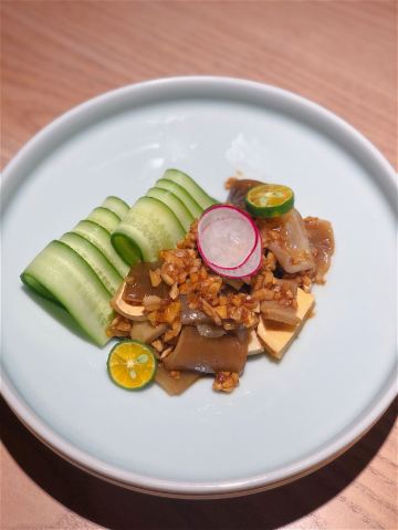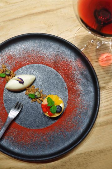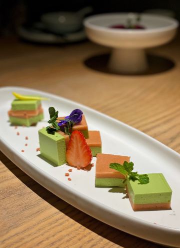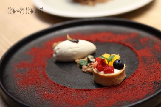 YoYo_7X0Y4A4P来到位于莲花一栋独栋别墅“半未.时宜”,整体通透简洁的设计风格十分合我胃口,名字也非常有意思,半未让我想到了“半欲天明半未明,醉闻花气睡闻莺”的那种黎明破晓时分,因为夜里饮了酒微醉未醒之际,窗外飘进来花的香气和鸟的鸣叫的那种意境。也想到了另外“诗家清景在新春,绿柳才黄半未匀”美丽的早春景色最能激发诗家的诗情,绿枝上刚刚露出的几颗柳芽有的嫩黄有的嫩绿。 时宜,是店家希望在最适合的时间用最好的食材呈现出最合时宜的美味,这个愿景说起来简单做起来可就相对比较复杂了,对于季节时令的把控需要十分到位。 而我的理解上则需要更进一步,包括店内的装修风格以及餐具摆设等大大小小的东西都要按照完整统一的定位来安排,这点上我觉得半未做得还算不错! 克利曼丁红橘慕斯让我眼前一亮,手工制造的橘柑造型十分讨喜,新鲜熬制的橘肉果酱在浓郁香甜的慕斯的棉柔里无法自拔,像极了爱情、、、 莓香芝士水果塔也是一道非常吸引眼球的甜品,水果小塔派里有酸奶、芝士、时令水果,搭配着入口即化的慕斯,红丝绒的摆盘赏心悦目,还没有开始吃就已经先醉了。 南岛椰子慕斯挖取新鲜椰子肉完美融入慕斯,法芙娜巧克力做成的椰子壳栩栩如生,表面还有一个一个的水珠。 糊辣酥骨珠带鱼、秋葵芥味海蜇头、百香果醋凤爪、吉祥红糟炸醋肉都秉承着小而美而精的理念,份量不多味道不错!
